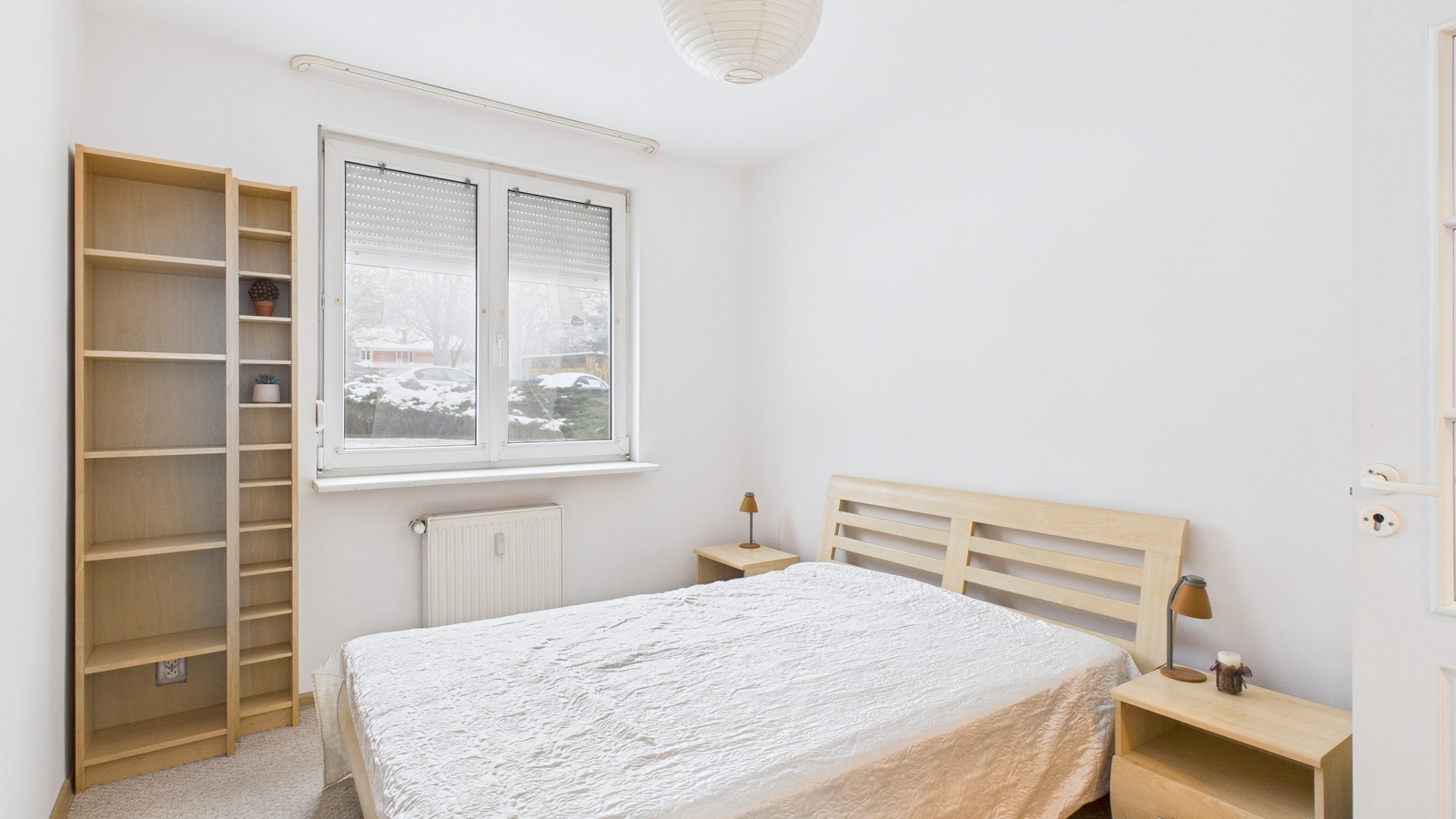 - pokój (łóżko, dwie szafki nocne z lampkami nocnymi, trzy regały, komoda, stolik kawowy)