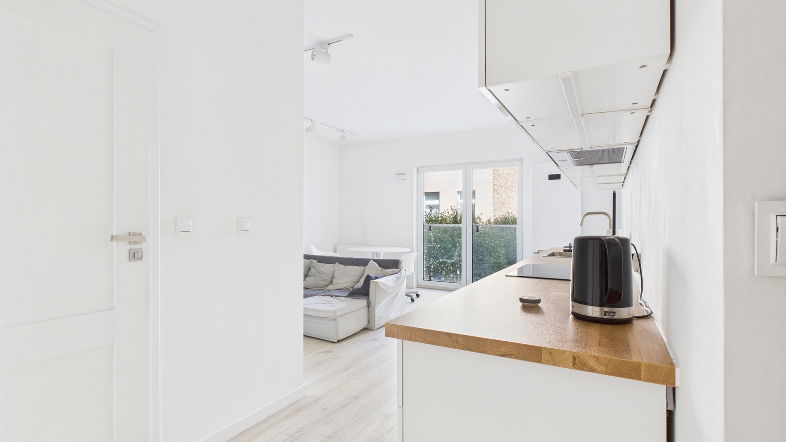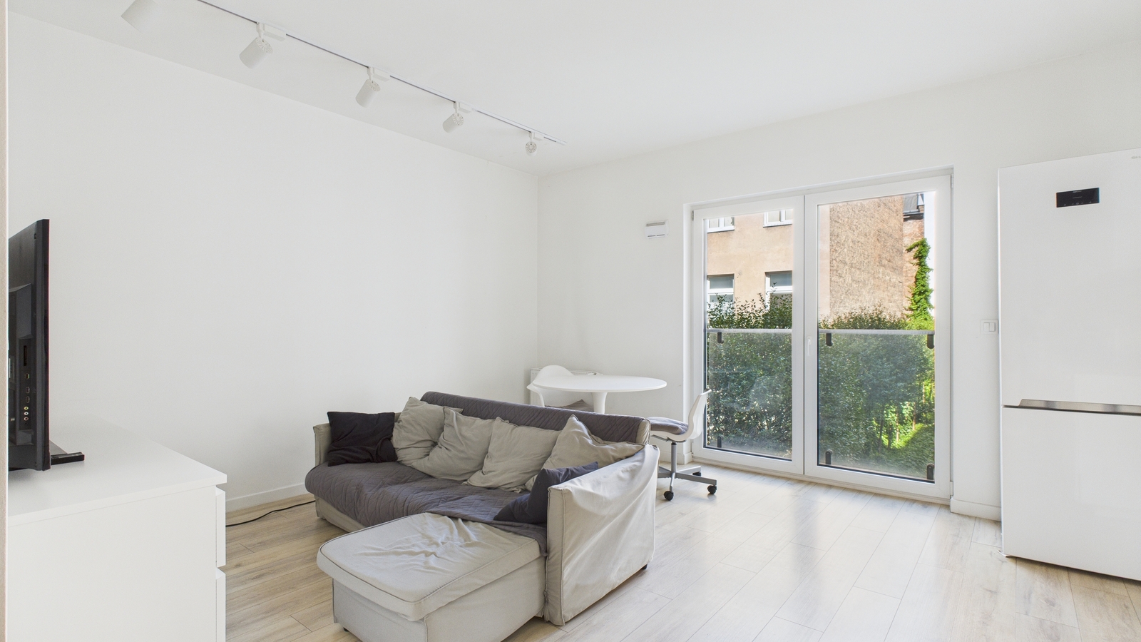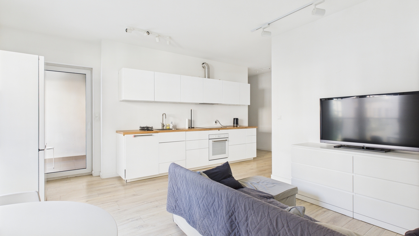 - Przestronny salon z aneksem kuchennym i wyjściem na balkon
