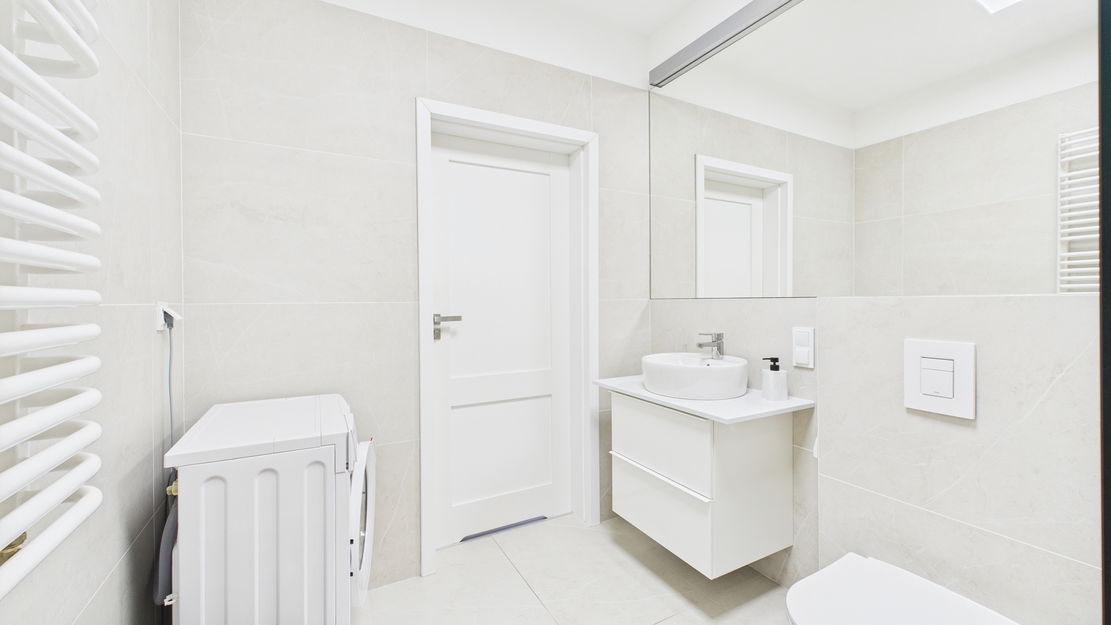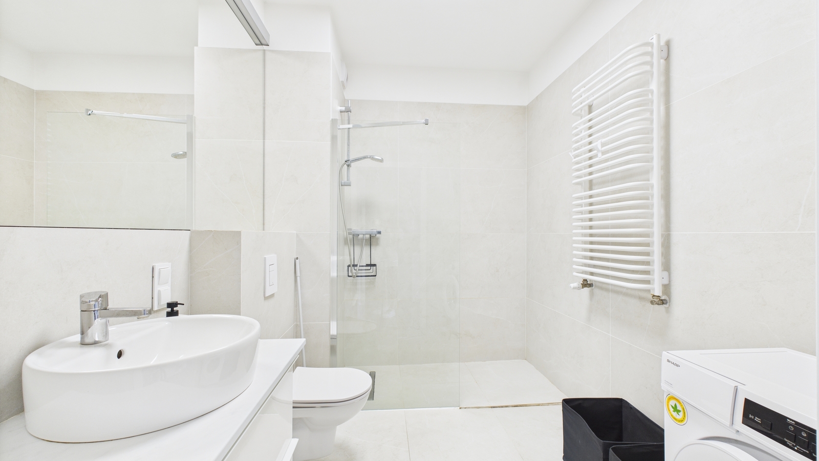 - Łazienka z prysznicem typu walk-in, pralką i miejscem na przechowywanie