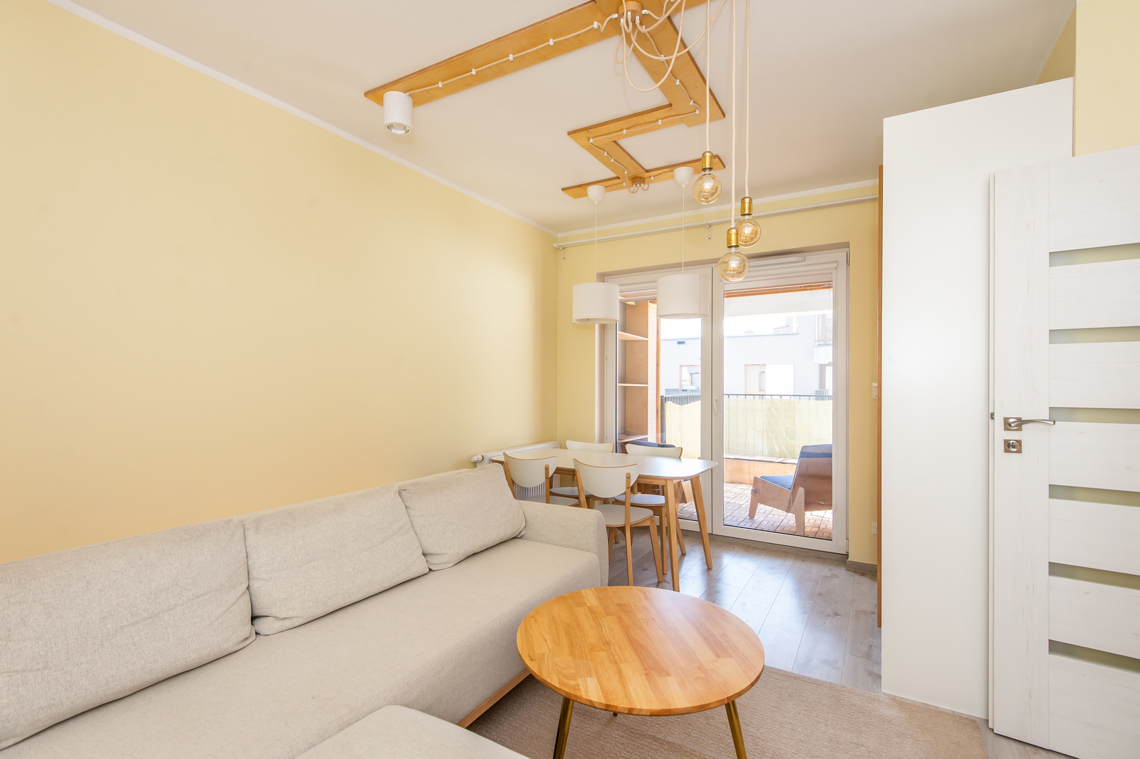 -salon (wyposażony w kanapę, szafki, stolik kawowy, stół z 4 krzesłami, szafę)