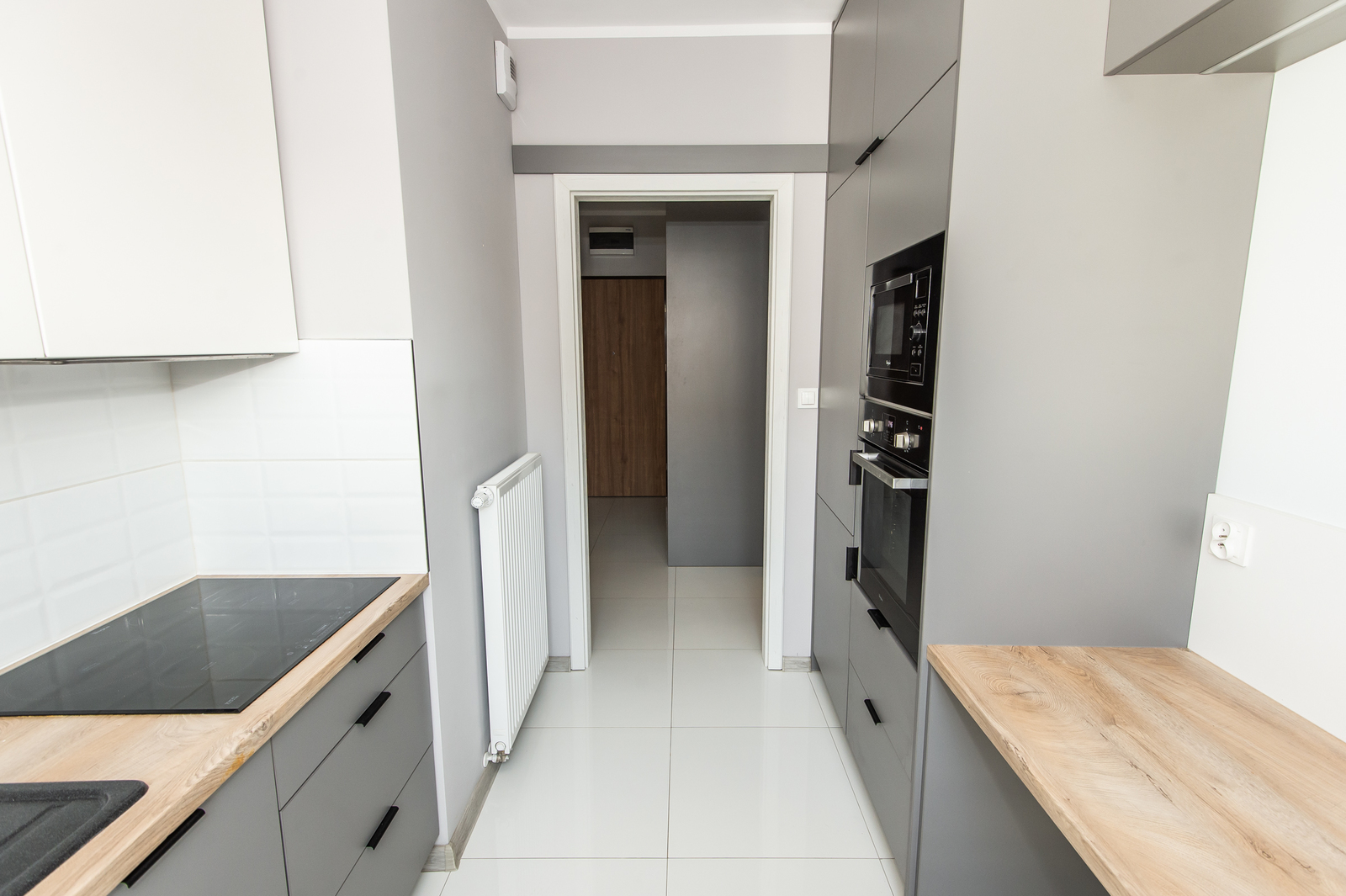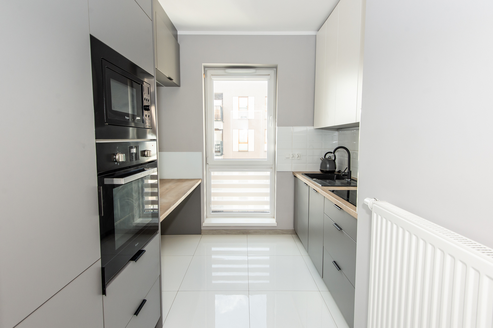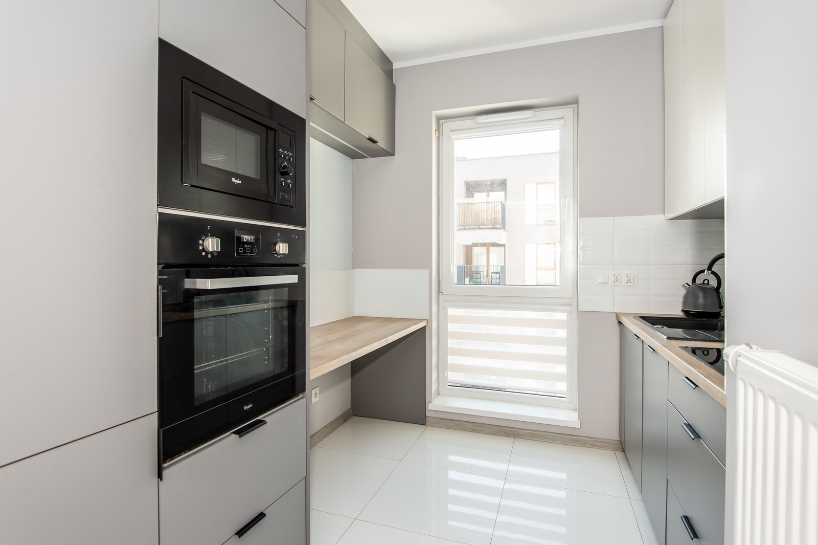 -kuchnia (oddzielna, jasna z oknem; ze zmywarką, mikrofalówką, lodówką z zamrażalnikiem w zabudowie, piekarnikiem, płytą indukcyjną, okapem, zlewem, czajnikiem elektrycznym)
