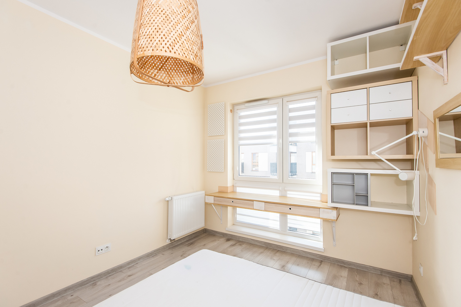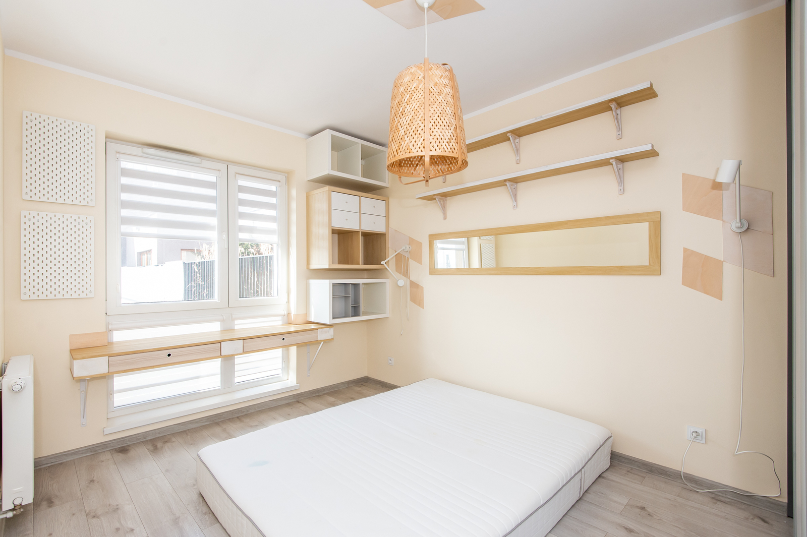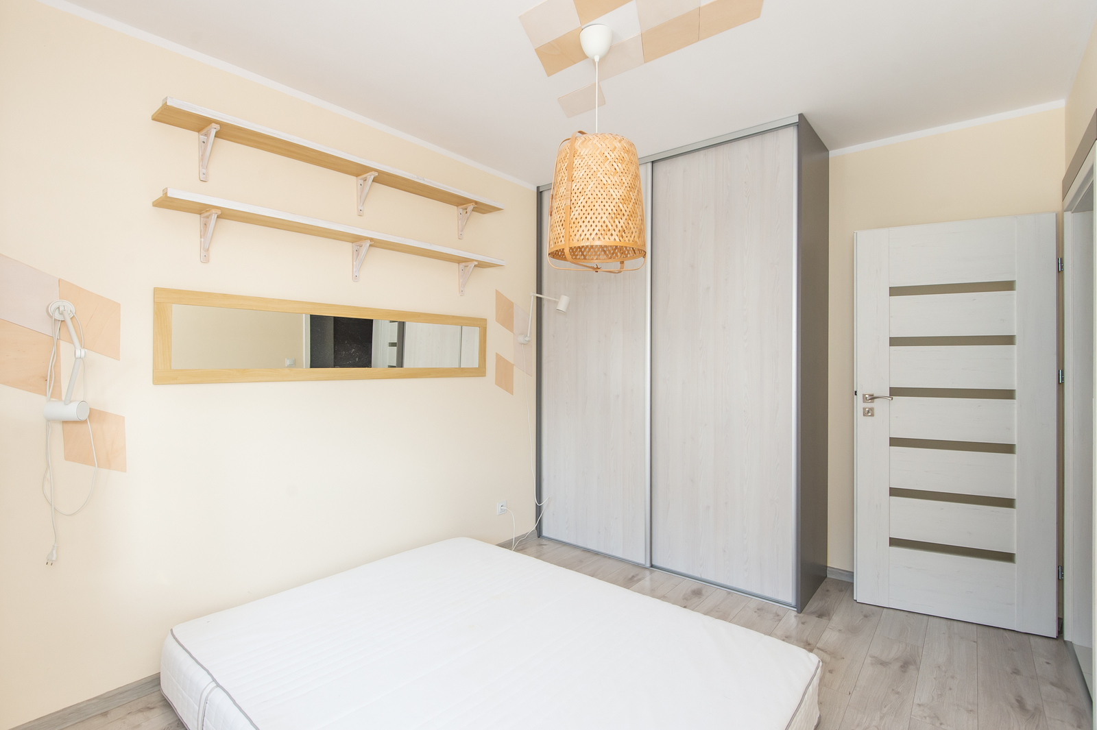 -sypialnia (z praktyczną szafą, stoliczkami nocnymi z lampkami, półkami, szafkami, lustrem, biurkiem; na ten moment jest sam materac, możliwość wstawienia łóżka)