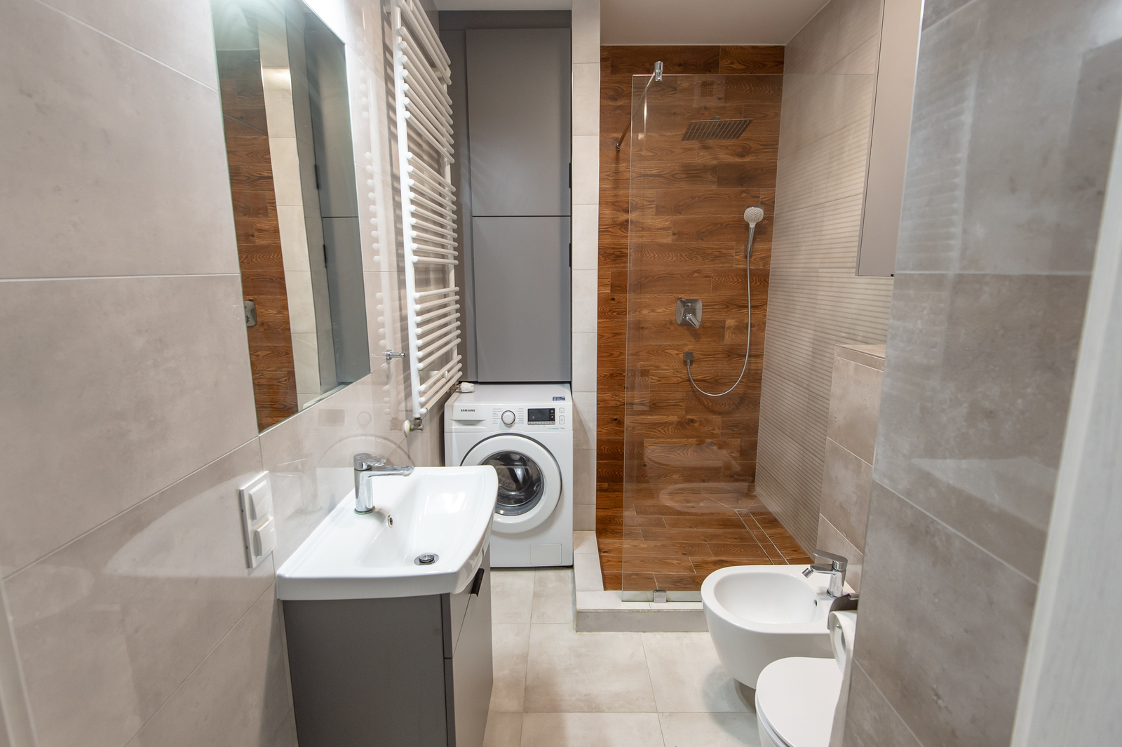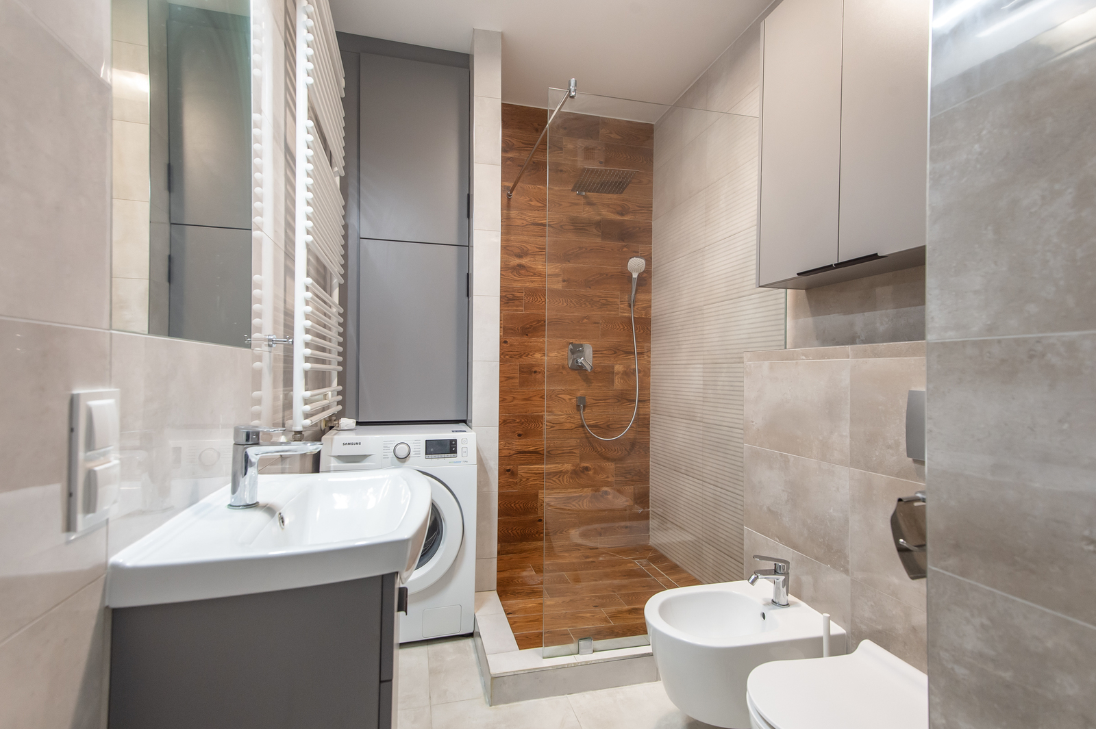 -łazienka (z prysznicem, umywalką z pojemną szafką, lustrem, pralką, toaletą i bidetem)