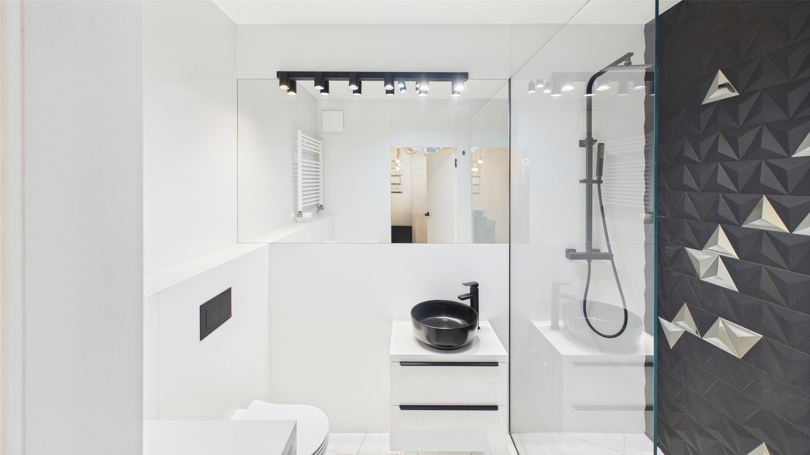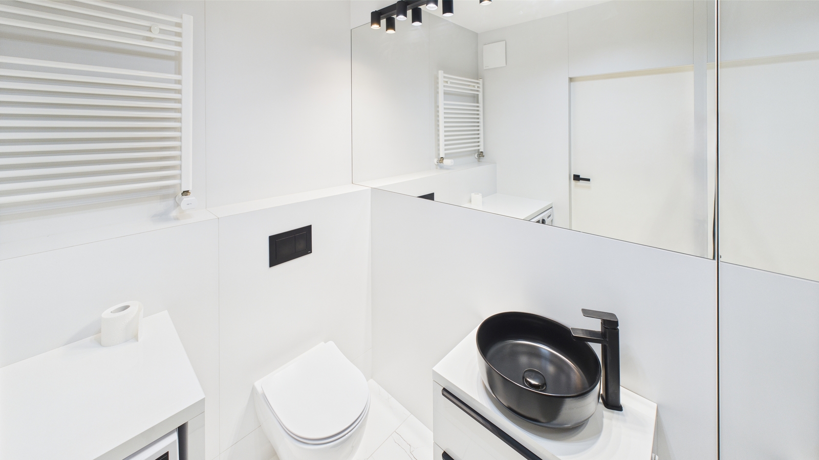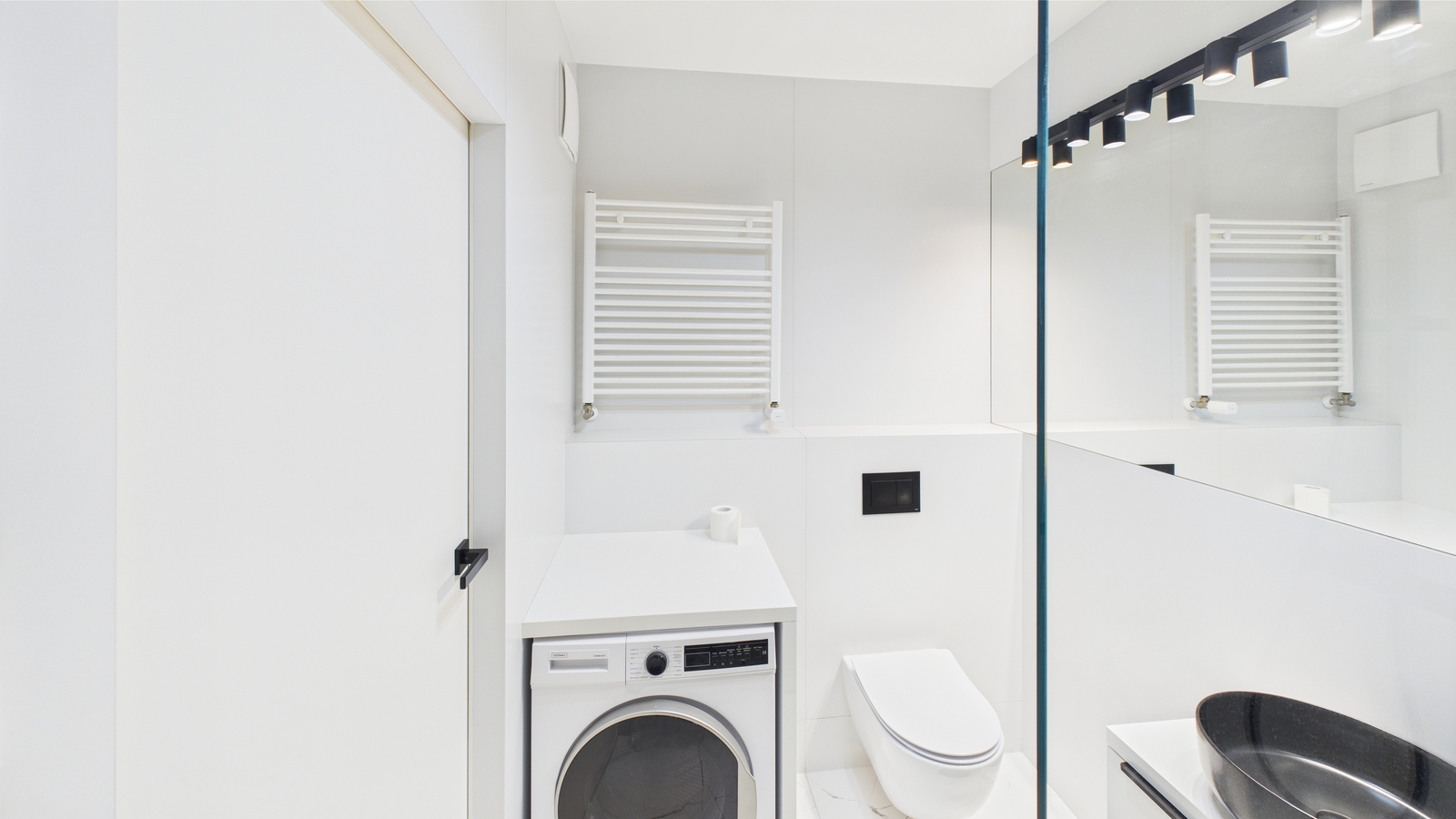 - Stylowej łazienki z kabiną prysznicową oraz pralką.