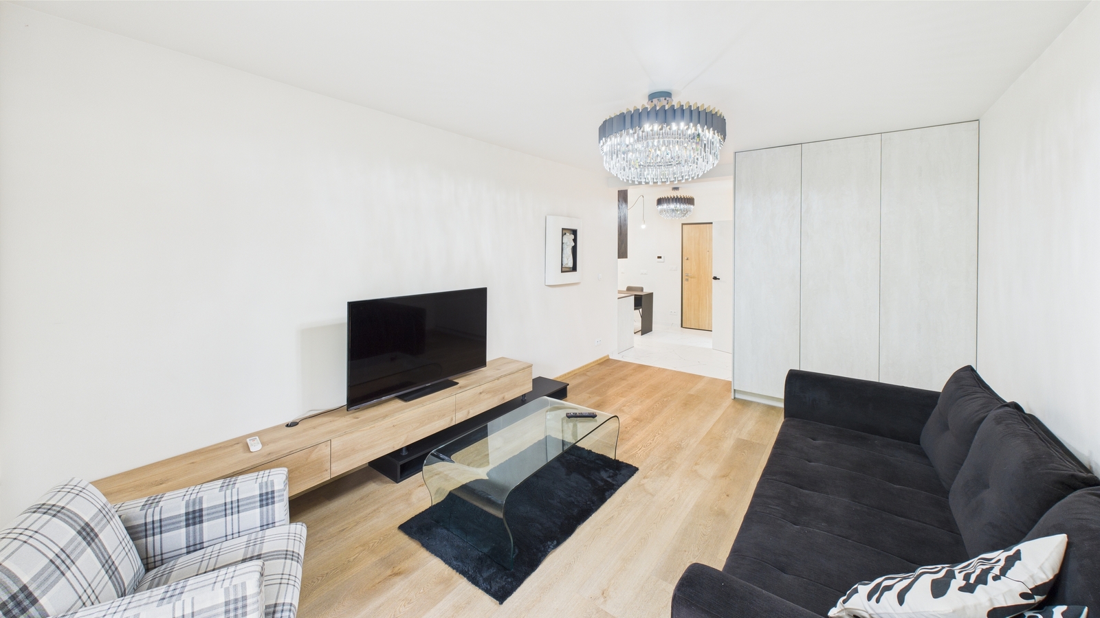- Przestronnego salonu z wygodną, rozkładaną sofą, dwoma fotelami, dużą pufą, pojemną szafą, podwieszaną komodą RTV oraz telewizorem.