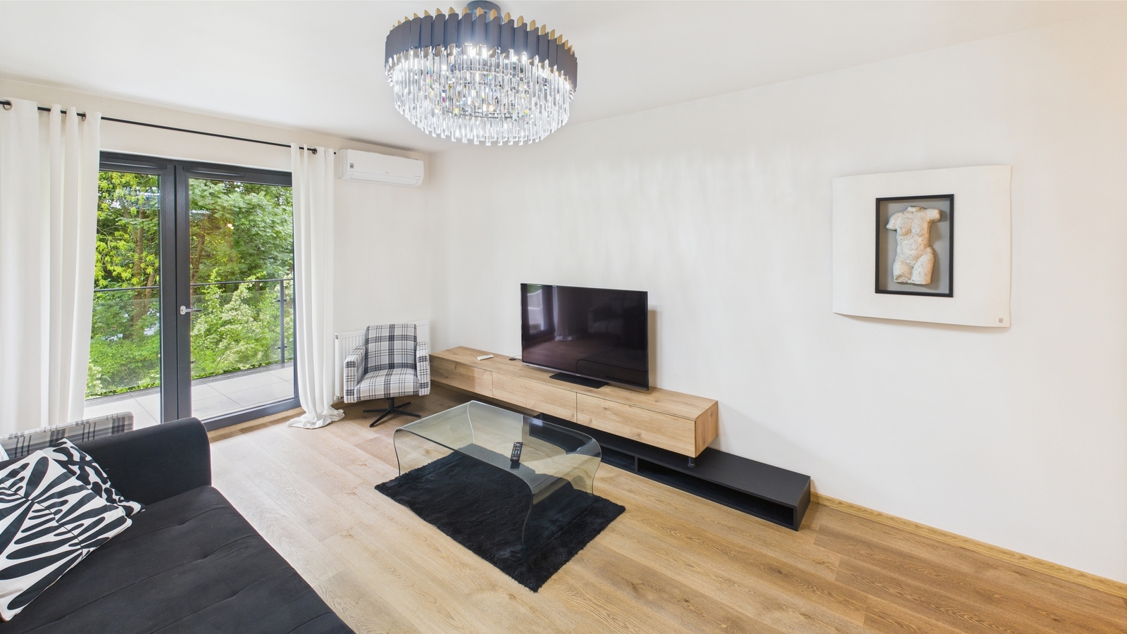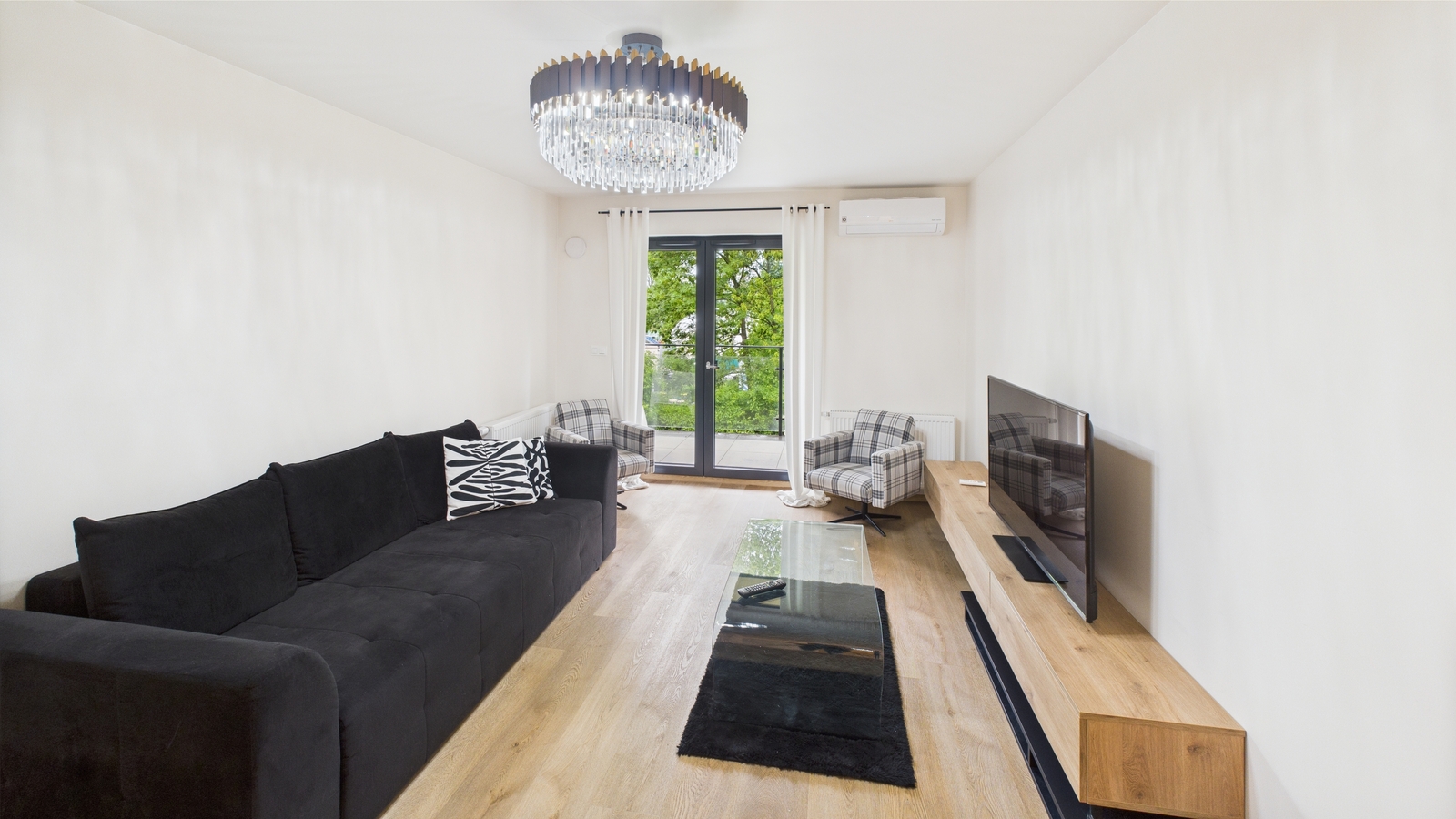Wnętrze zdobią efektowne, szklane żyrandole, które nadają apartamentowi wyjątkowego charakteru. Mieszkanie posiada klimatyzację, okna PCV wychodzące na stronę północno-wschodnią oraz dostęp do szybkiego internetu.