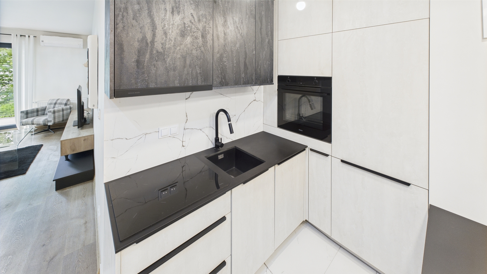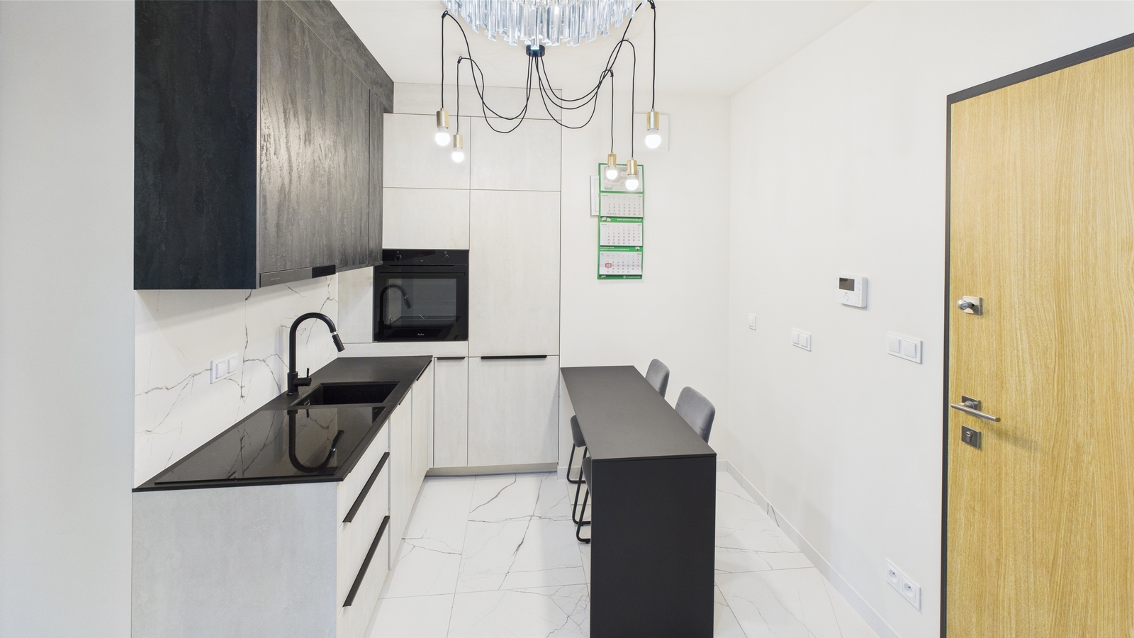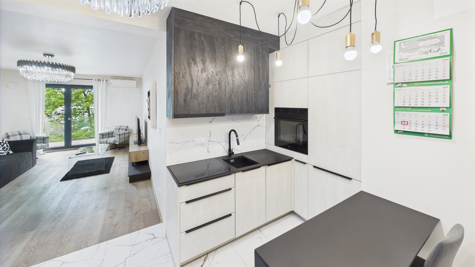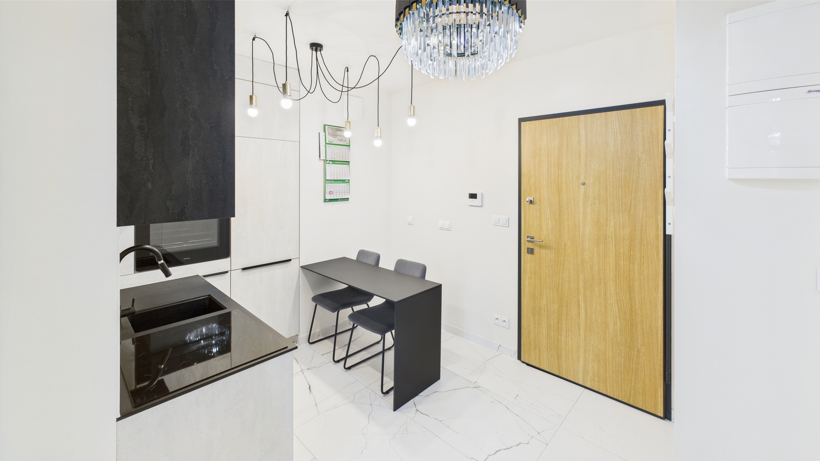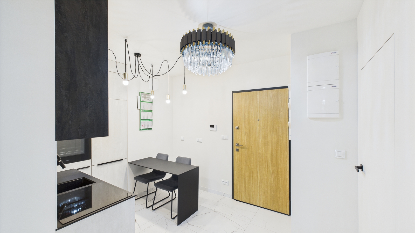 - Aneksu kuchennego z nowoczesną zabudową: piekarnik, płyta indukcyjna, okap, lodówka z zamrażarką, stół i dwa krzesła.