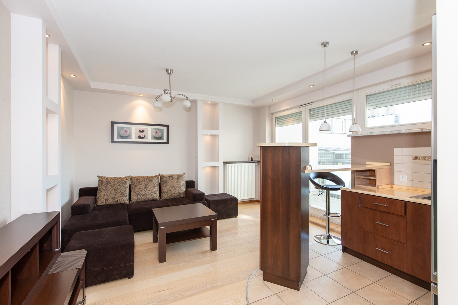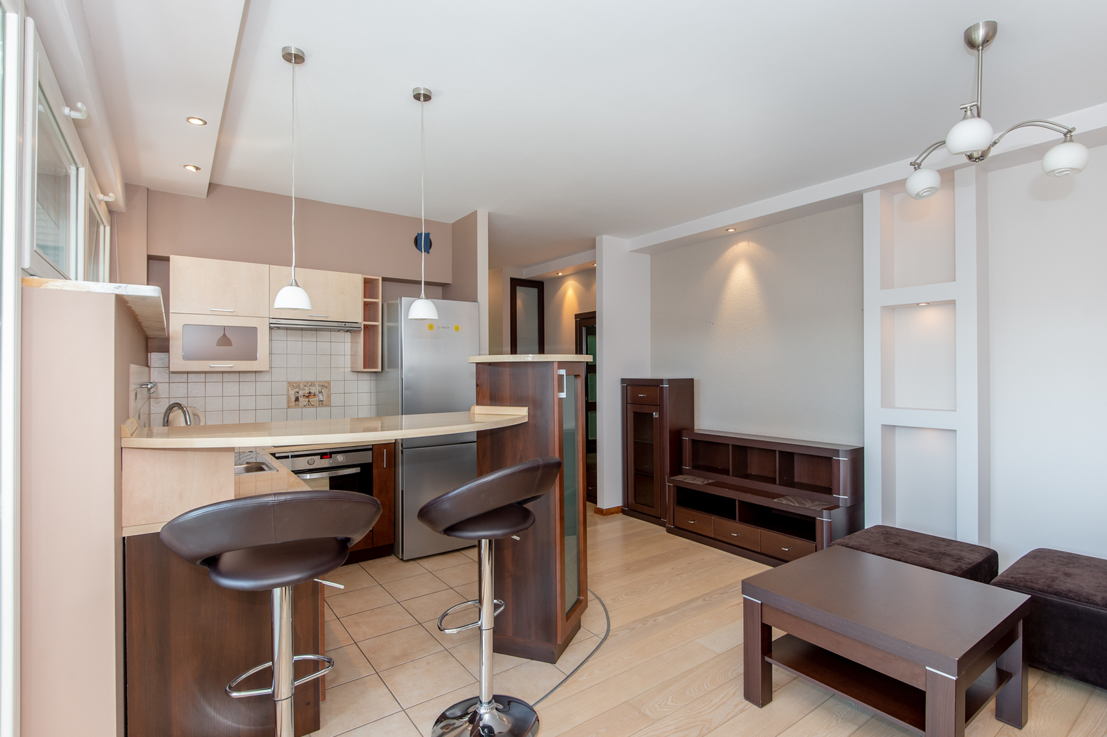 ANEKS KUCHENNY: meble w zabudowie, lodówka z zamrażarką, płyta indukcyjna, piekarnik, okap kuchenny, zlewozmywak, półwysep kuchenny z dwoma hokerami.