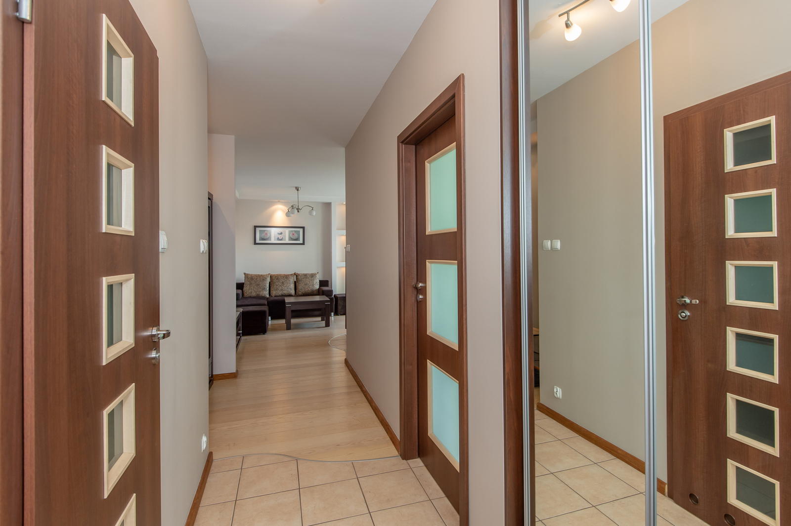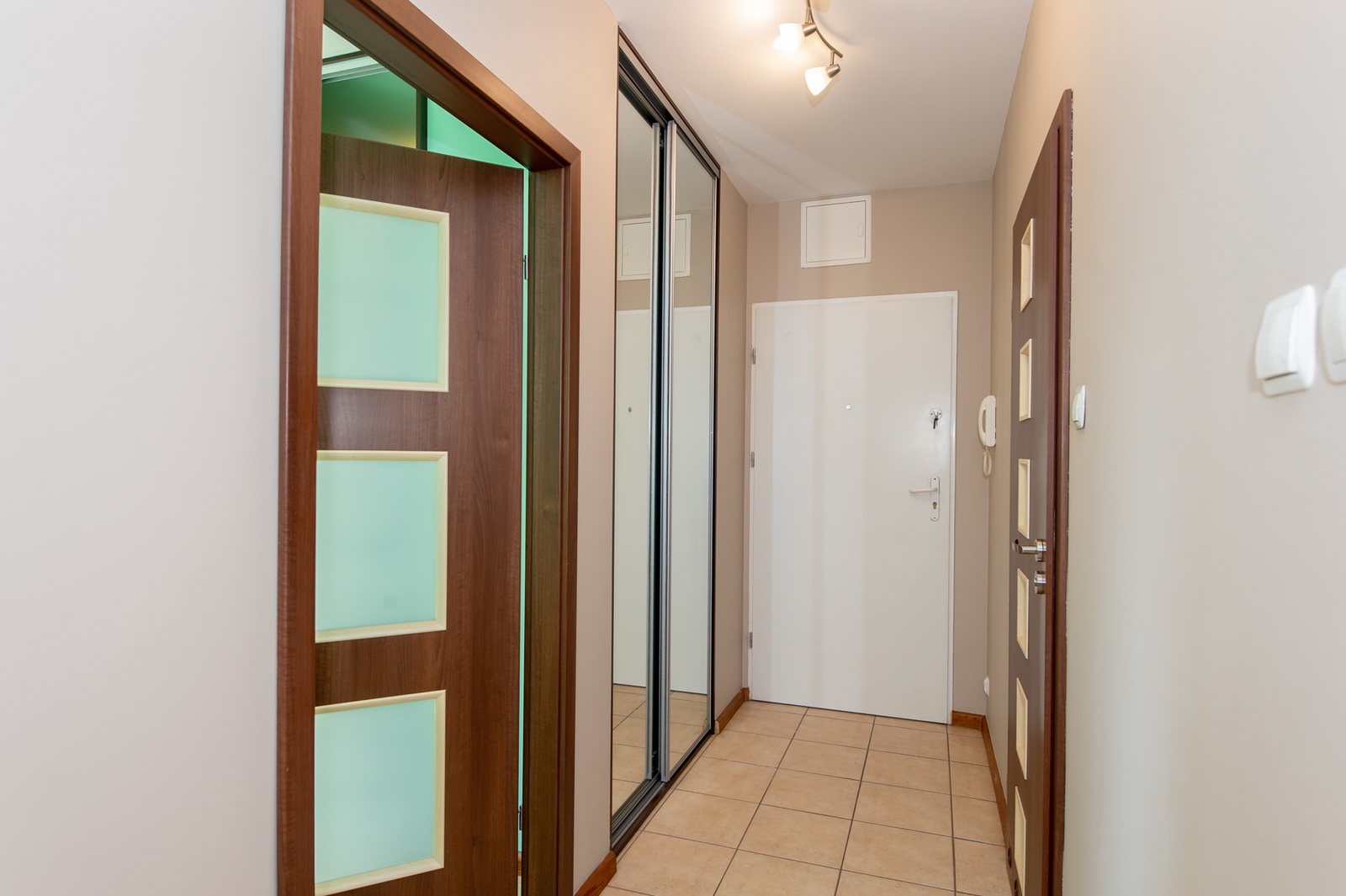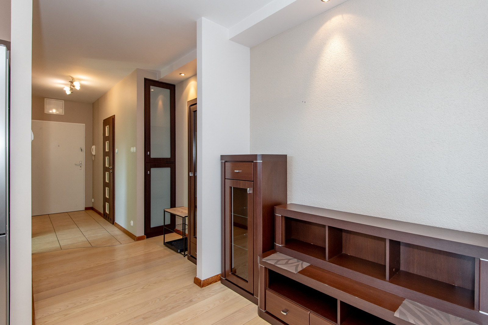KORYTARZ: zabudowana szafa na odzież wierzchnią, zabudowany regał, szafka na buty.