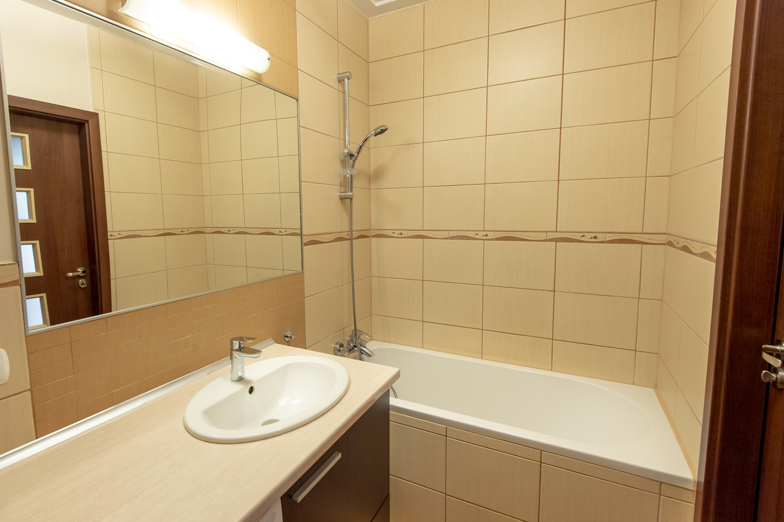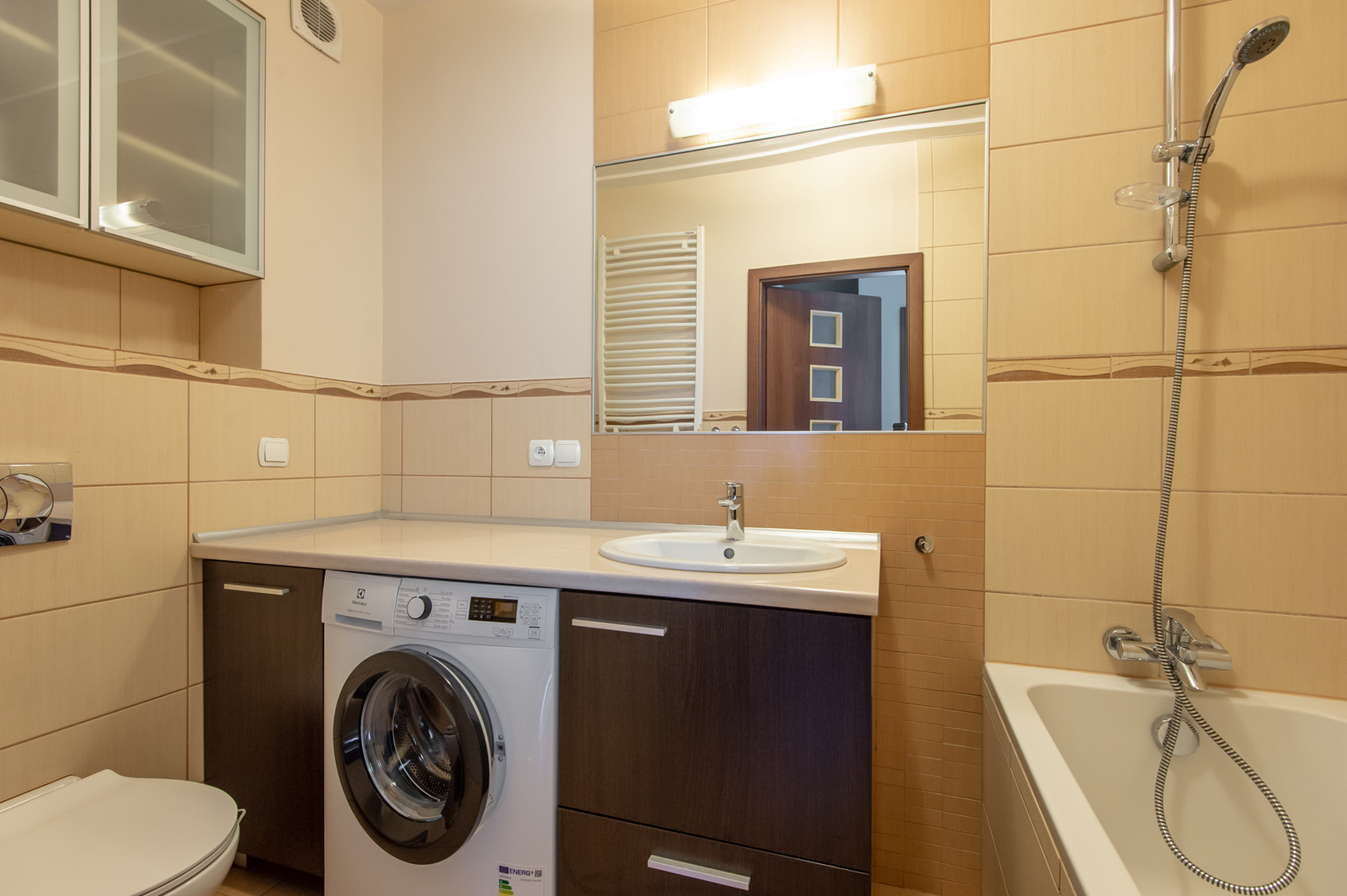 ŁAZIENKA: wanna, umywalka z szafkami w zabudowie, pralka, lustro, toaleta.
