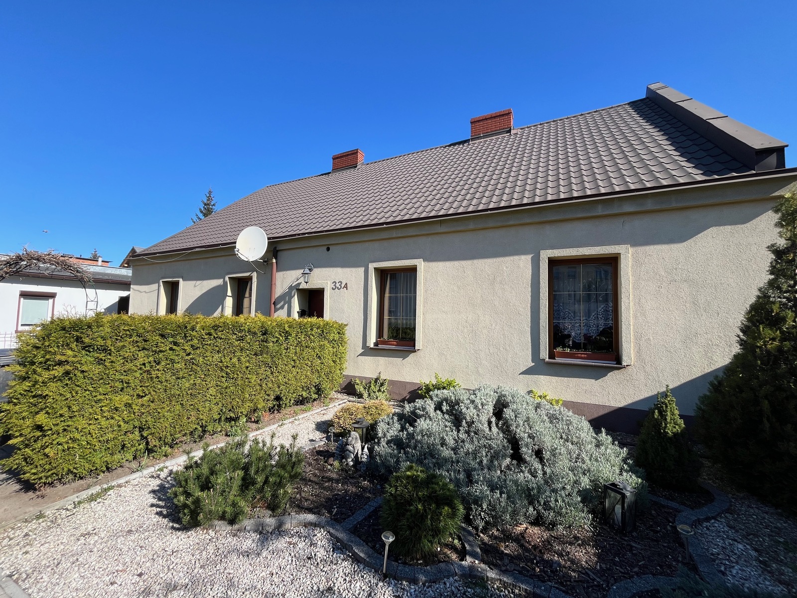 Dom jest parterowy wraz z poddaszem użytkowym, teren jest ogrodzony, wjazd na posesje jest wyłożony kostką brukową.
