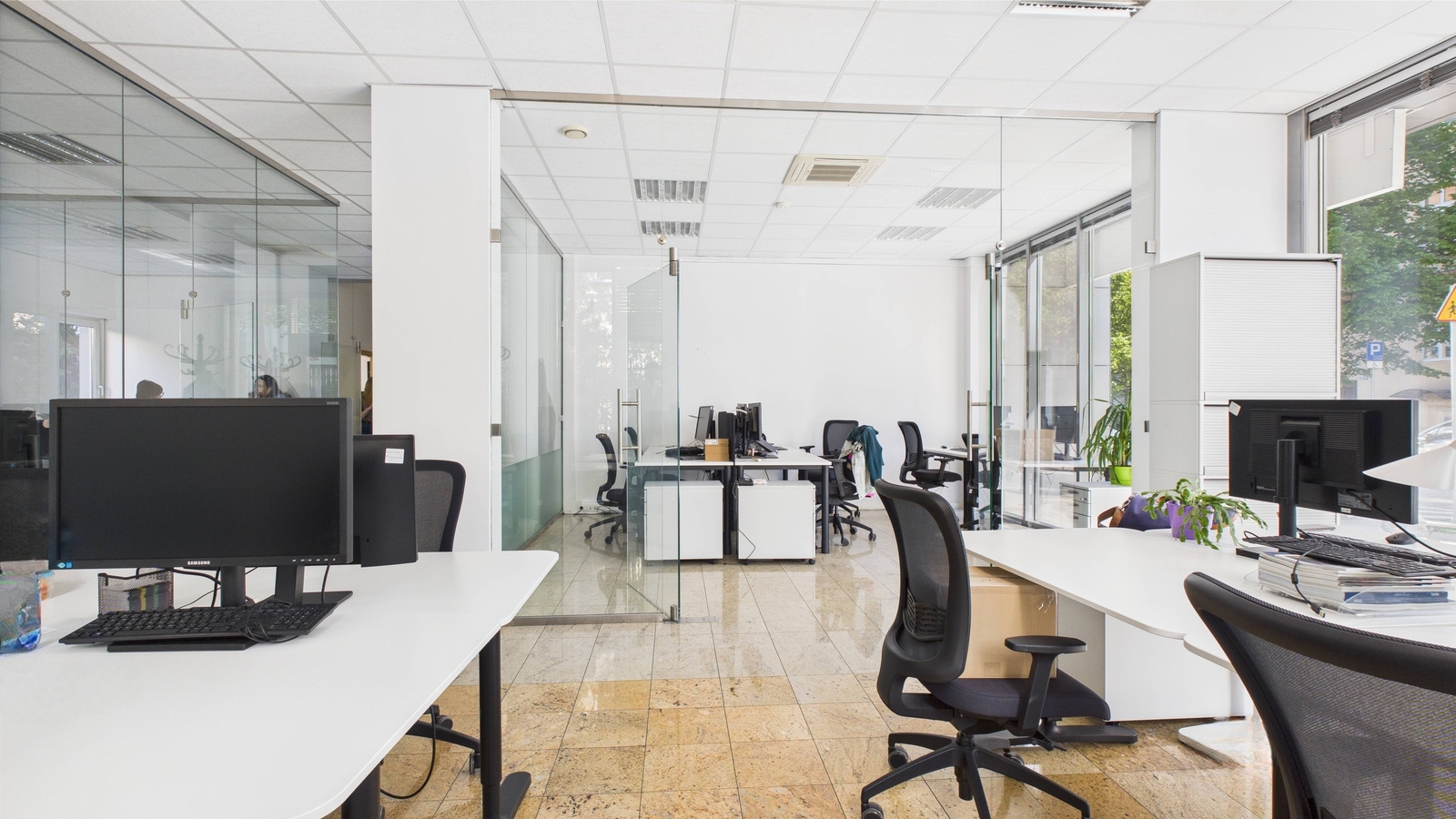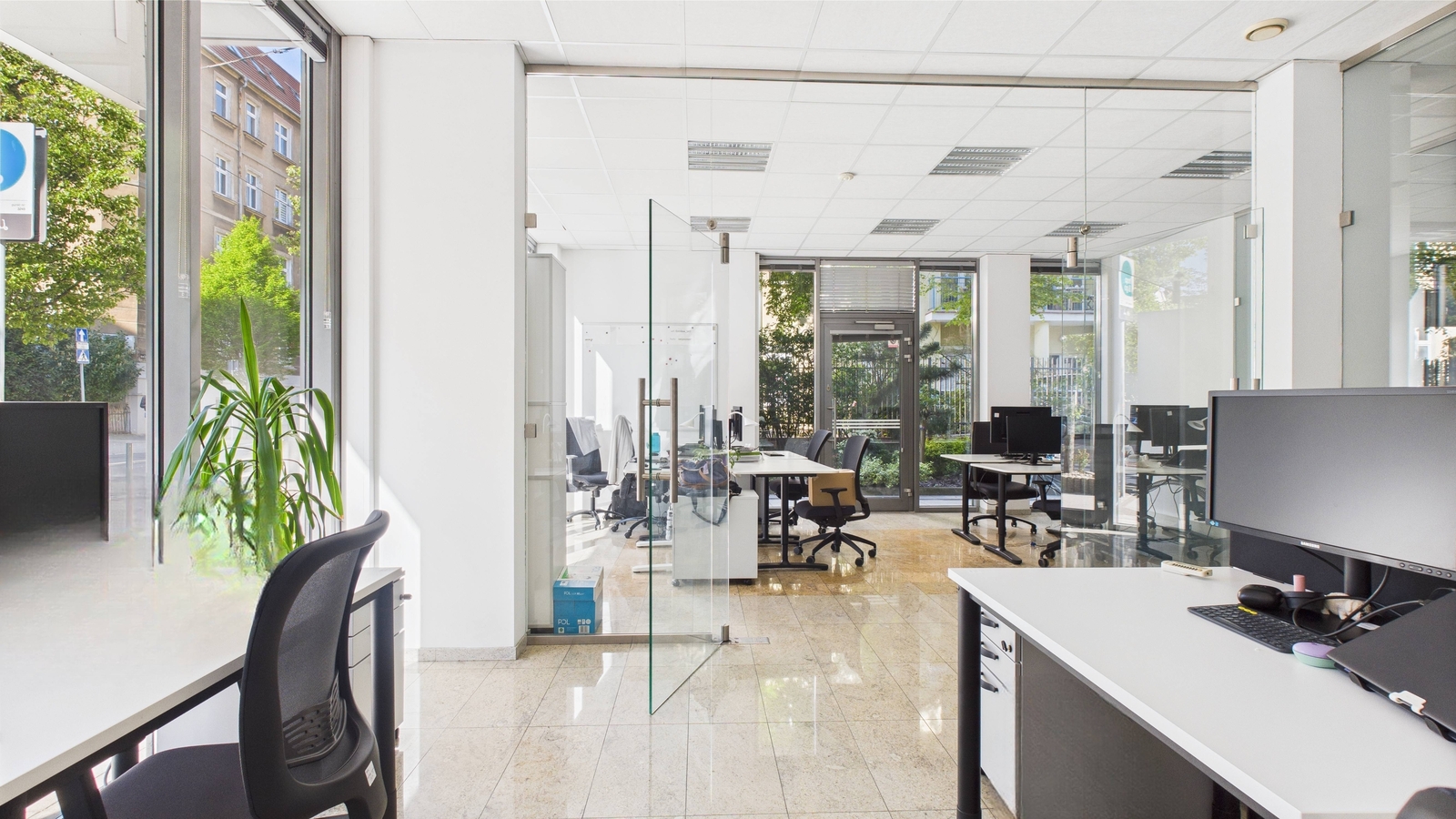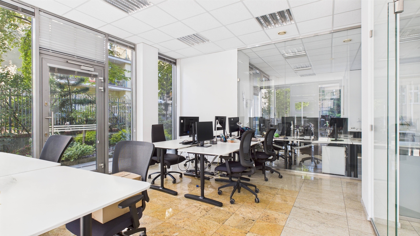 - Wnętrze nieruchomości jest bardzo przestronne – 117 m² starannie zaprojektowanej powierzchni – oraz dużymi witrynami sięgającymi poziomu chodnika, dzięki którym przestrzeń jest doskonale doświetlona naturalnym światłem. Dodatkowo układ obejmuje 4 pomieszczenia (w tym 3 z eleganckimi, przeszklonymi ścianami działowymi), co umożliwia wygodne rozmieszczenie biur, gabinetów lub sal obsługi klienta. Lokal został wykończony w wysokim standardzie: podwieszane sufity z nowoczesnym oświetleniem oraz klimatyzacja gwarantują komfortowe warunki przez cały rok, a na wyposażeniu znajduje się także aneks kuchenny, zaplecze socjalne, które podnosi funkcjonalność przestrzeni.