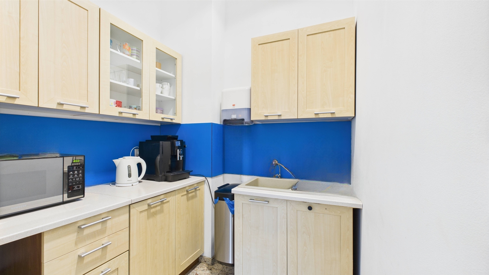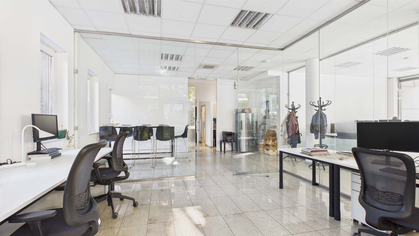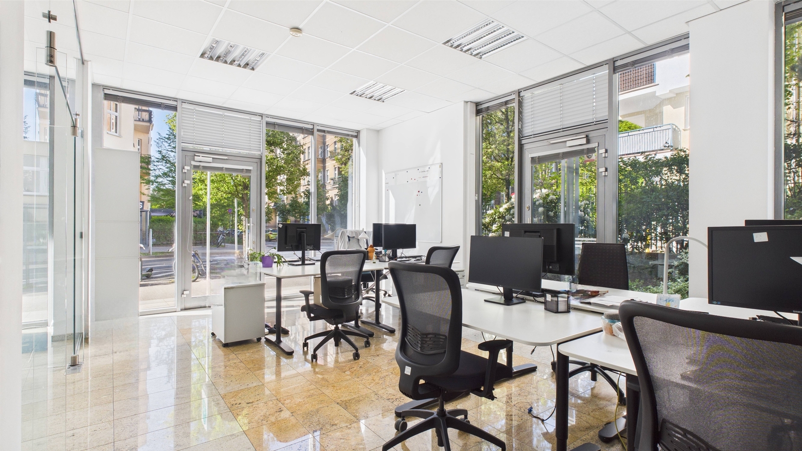 - Wnętrze nieruchomości jest bardzo przestronne – 117 m² starannie zaprojektowanej powierzchni – oraz dużymi witrynami sięgającymi poziomu chodnika, dzięki którym przestrzeń jest doskonale doświetlona naturalnym światłem. Dodatkowo układ obejmuje 4 pomieszczenia (w tym 3 z eleganckimi, przeszklonymi ścianami działowymi), co umożliwia wygodne rozmieszczenie biur, gabinetów lub sal obsługi klienta. Lokal został wykończony w wysokim standardzie: podwieszane sufity z nowoczesnym oświetleniem oraz klimatyzacja gwarantują komfortowe warunki przez cały rok, a na wyposażeniu znajduje się także aneks kuchenny, zaplecze socjalne, które podnosi funkcjonalność przestrzeni.