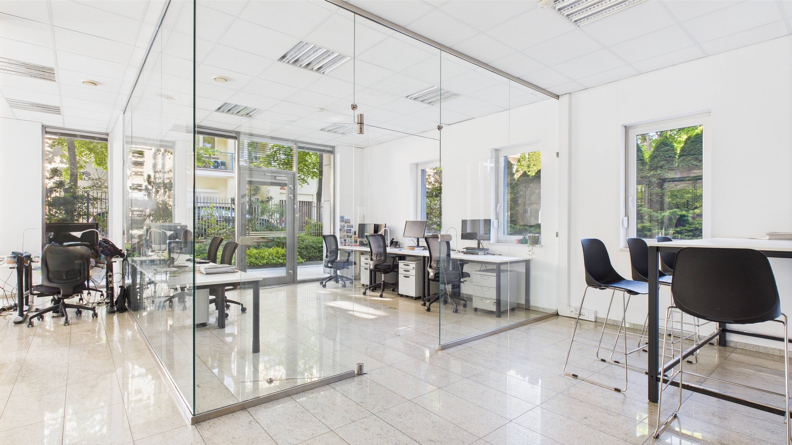 - Układ pomieszczeń: 4 pomieszczenia (3 z przeszklonymi ścianami) + aneks kuchenny + toaleta – funkcjonalny rozkład z możliwością adaptacji.