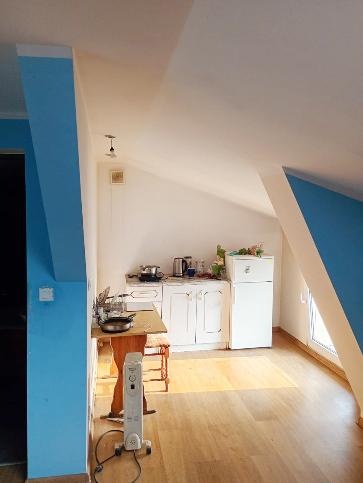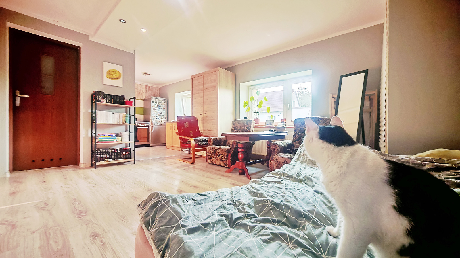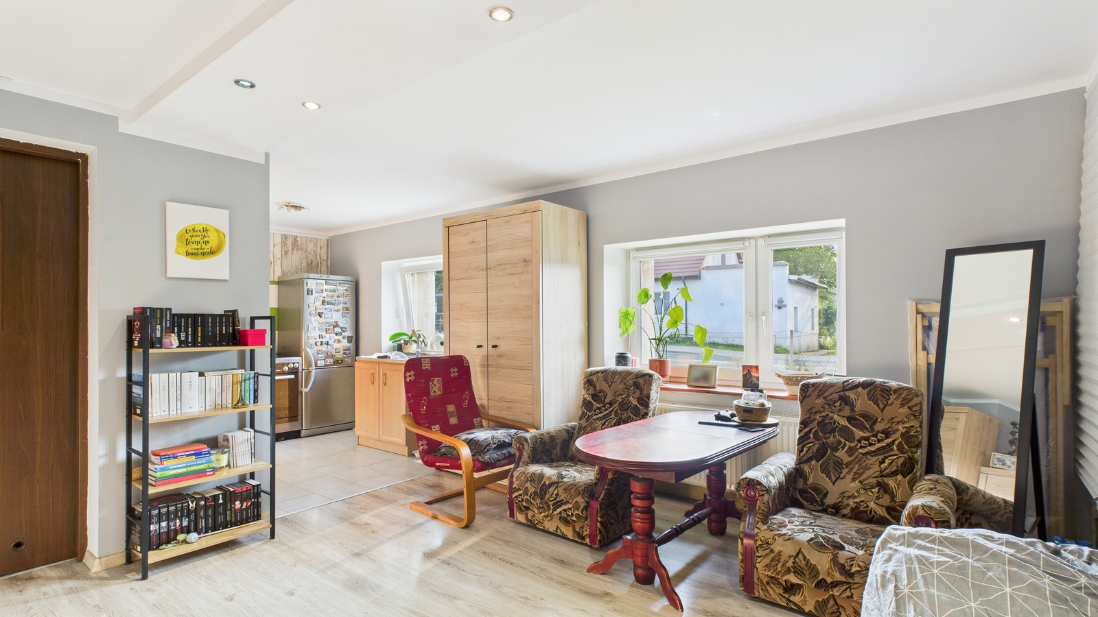 Pierwsze z nich jest dwupoziomowe, na dole, salon , kuchnia korytarz, u góry 2 sypialnie i łazienka. Dwa pozostałe to kawalerki. Piętro domu ma obniżony sufit, nie liczy się zatem do podatku. Dwa mieszkania przeszły generalny remont, jednak kawalerka jeszcze nie. W bryle domu jest tez kotłownia z piecem na ekogroszek. Kanalizacja miejska jest w trakcie budowy, aktualnie działa szambo 10m3.