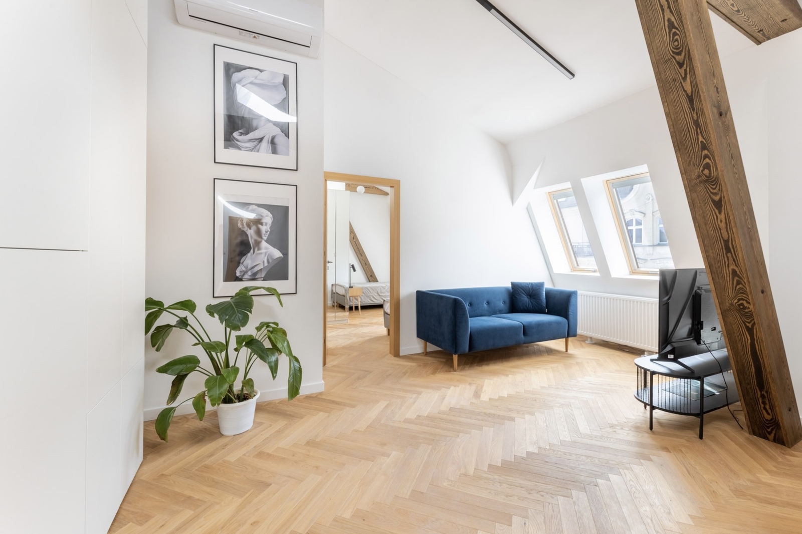 Drewniane podłogi, historyczne elementy wykończenia i eleganckie detale przywracają dawny klimat, uzupełniony o współczesny standard i wygodę.