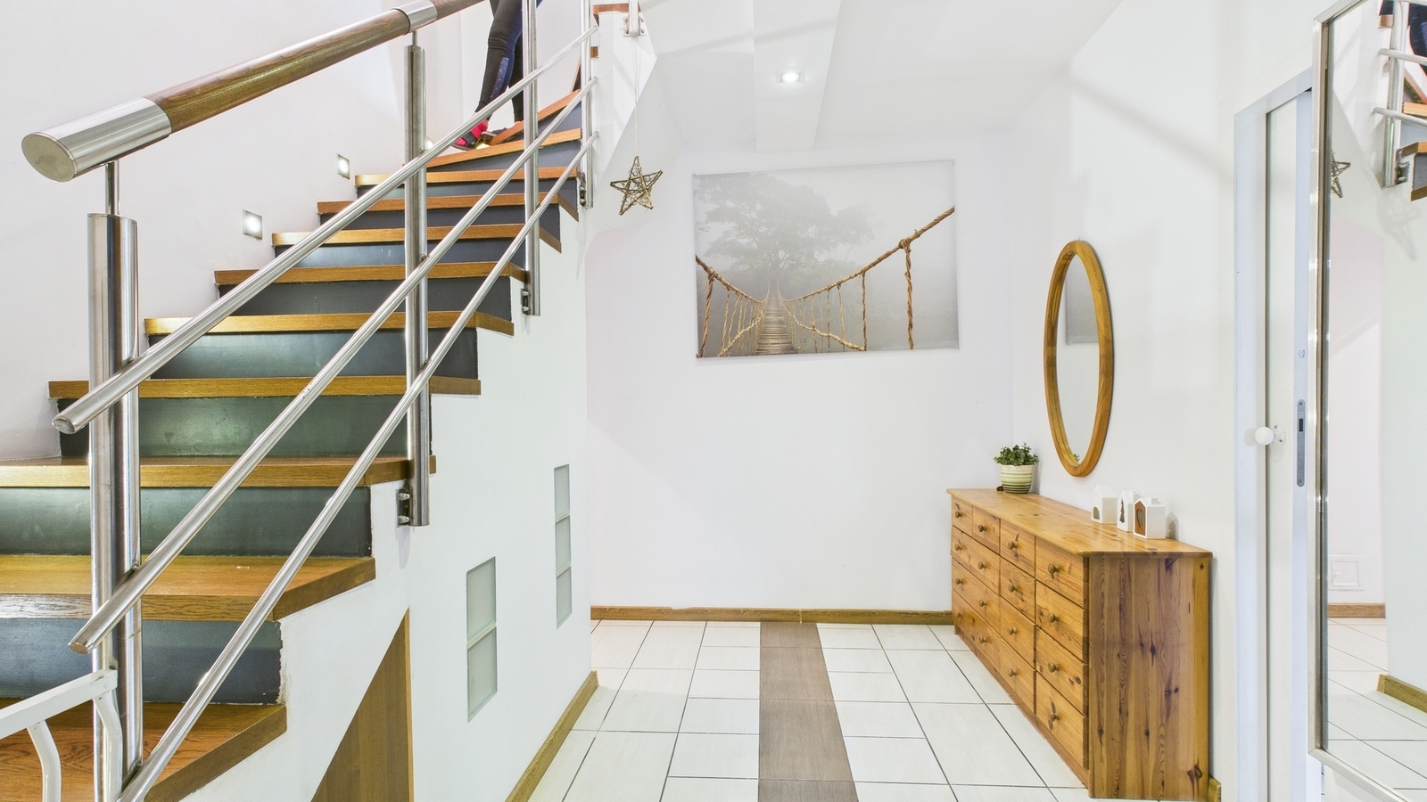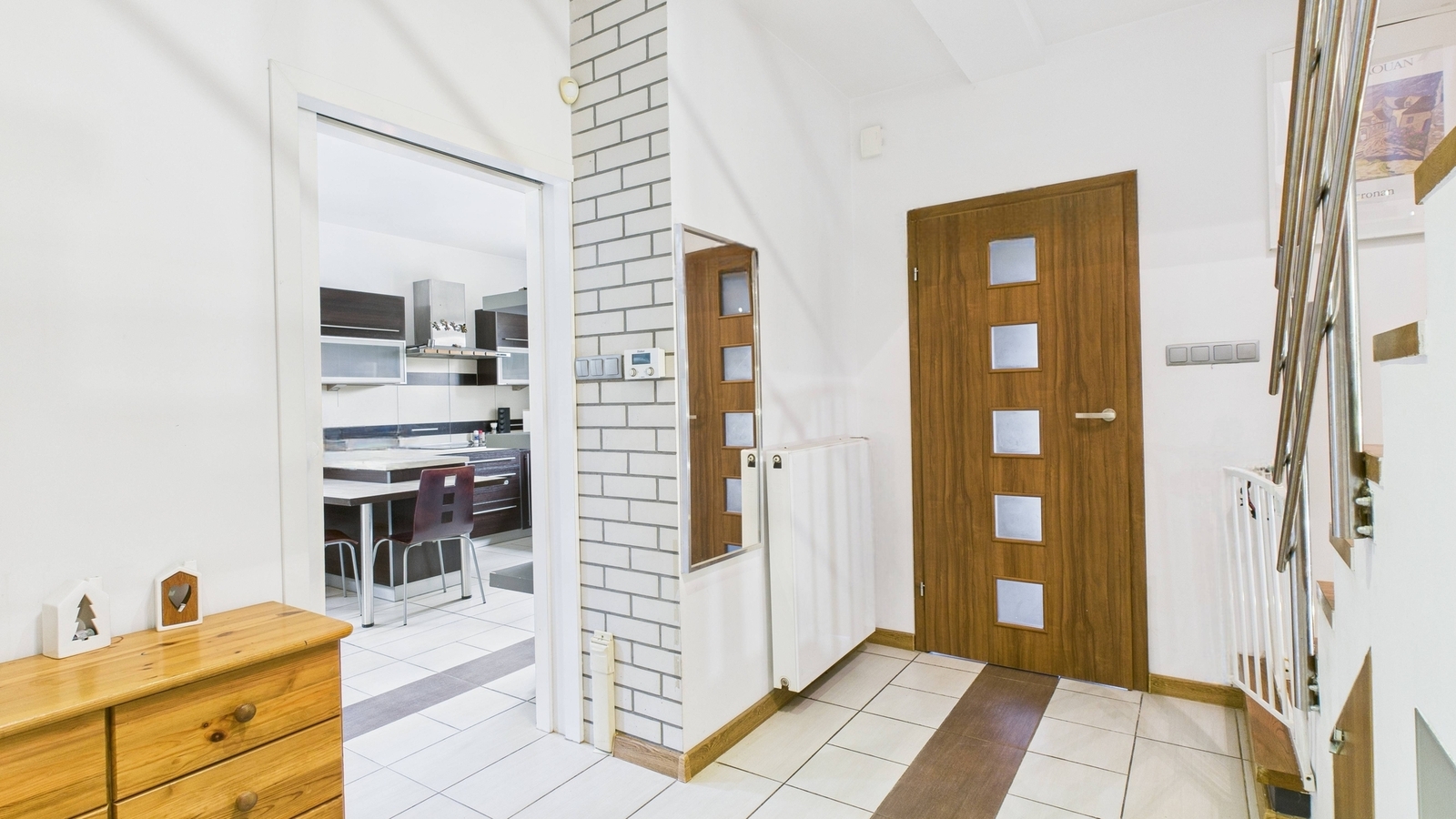 Okna PCV, drzwi antywłamaniowe, drewniane schody, na podłogach panele i płytki.