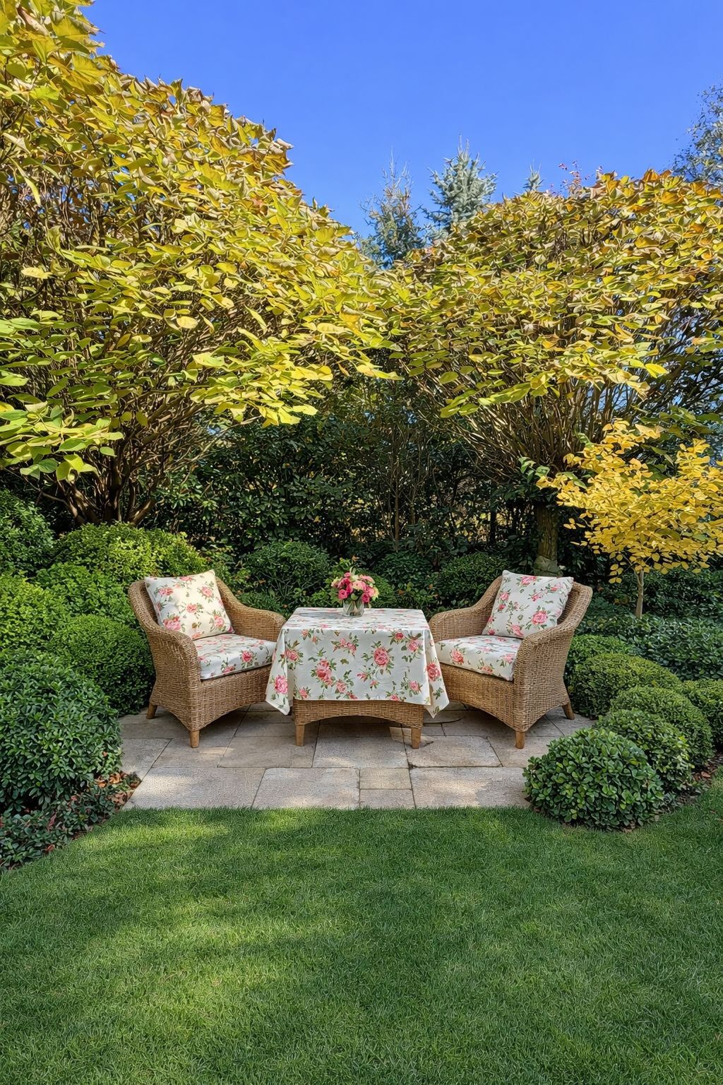 Taras wśród zieleni tworzy prywatną strefę relaksu, idealną na poranną kawę lub wieczorne spotkania przy winie.