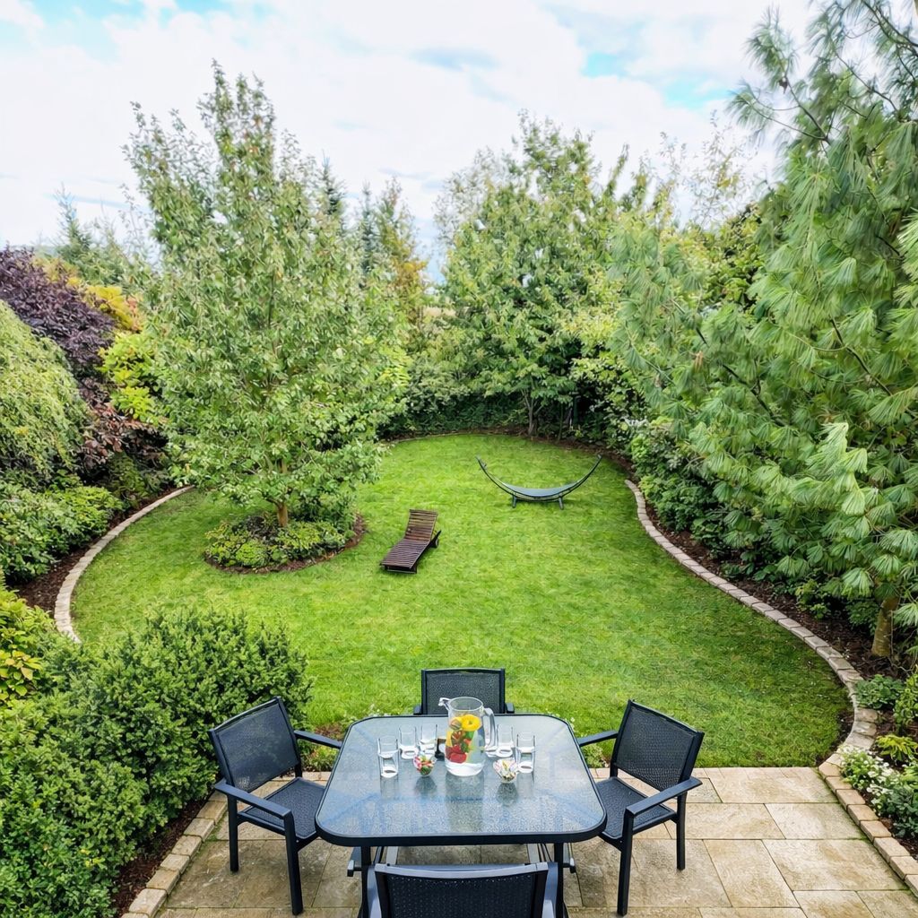 Zielona oaza spokoju – starodrzew, krzewy ozdobne, kwitnące rabaty i naturalne zacisze z miejscem na hamak.