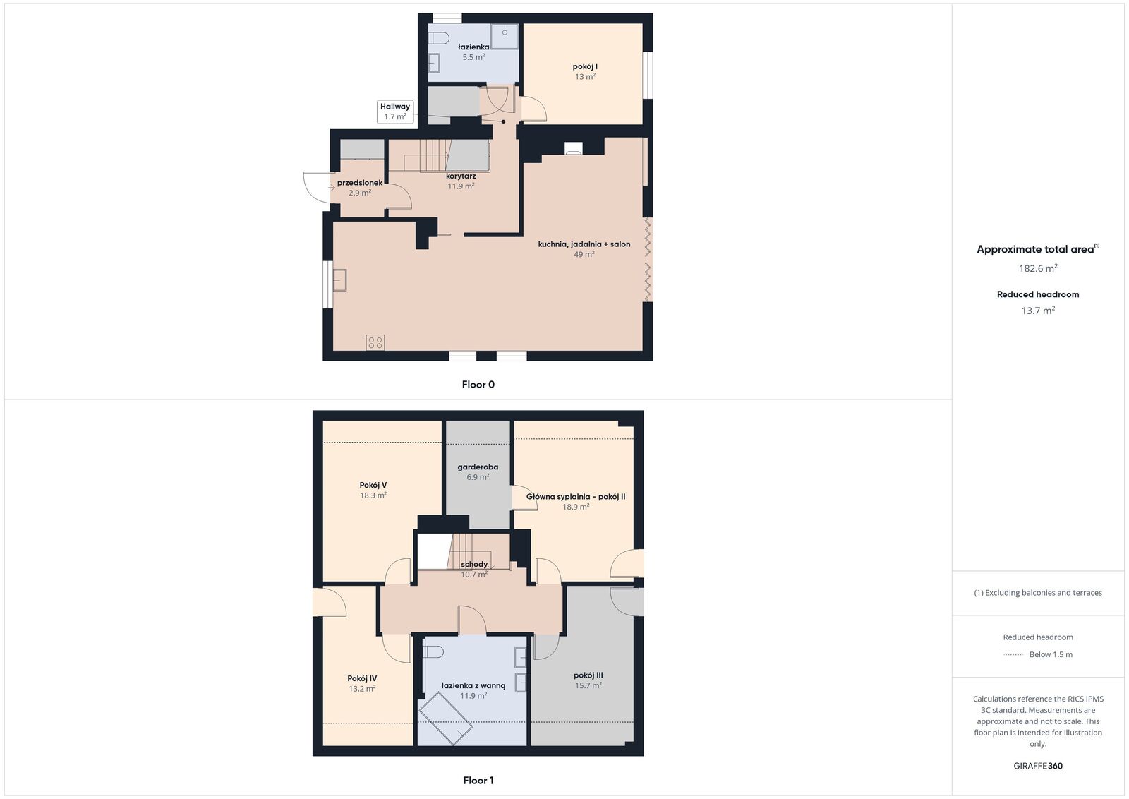 Na piętrze — cztery sypialnie (w tym główna z garderobą) oraz druga duża łazienka z wanną.