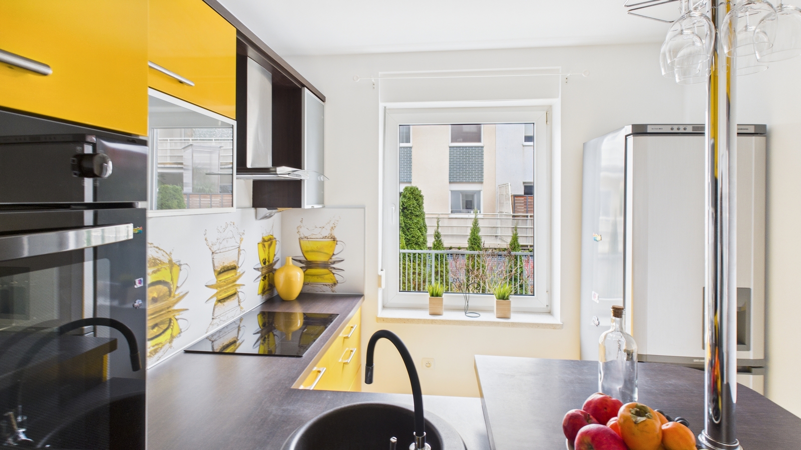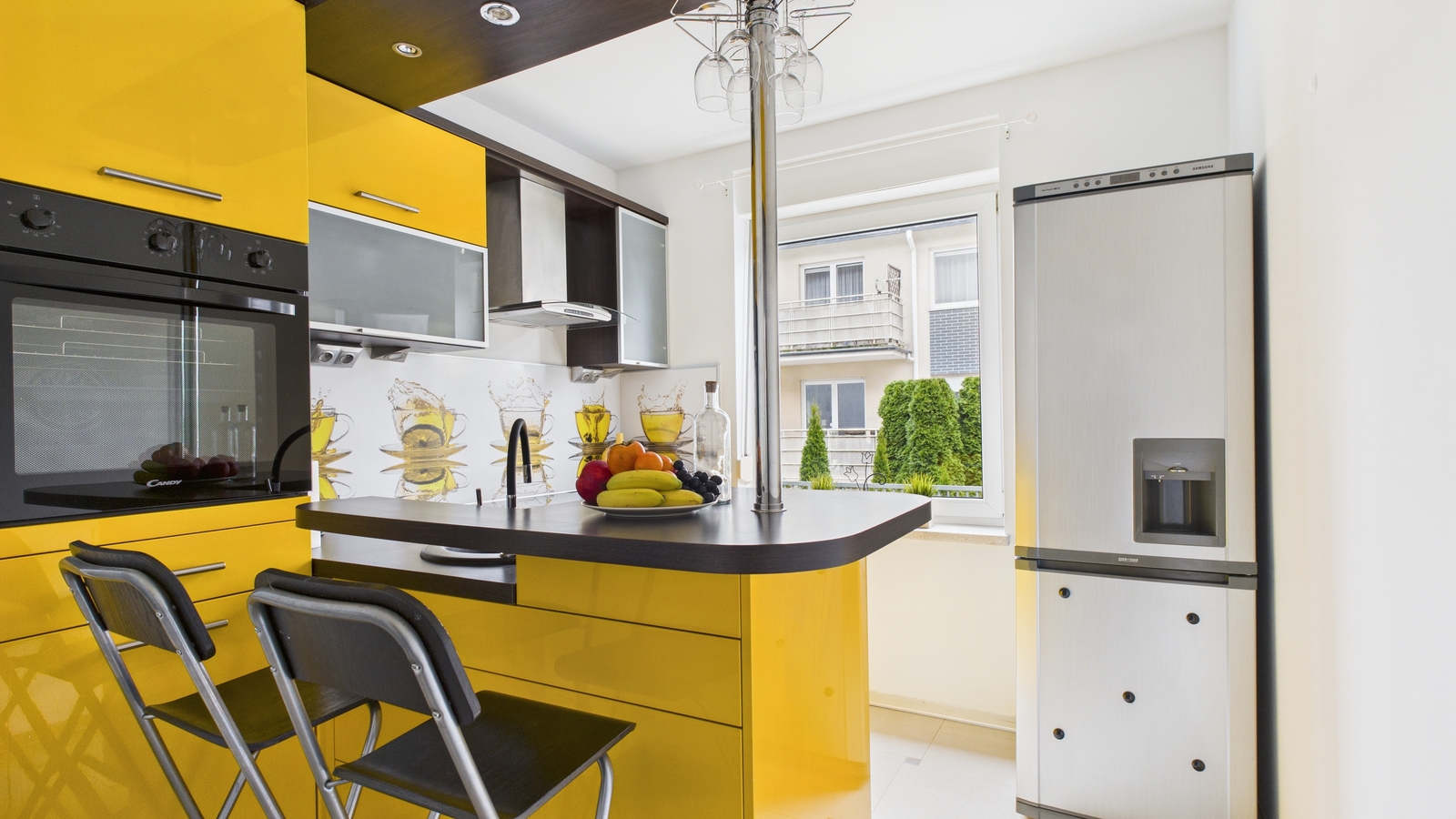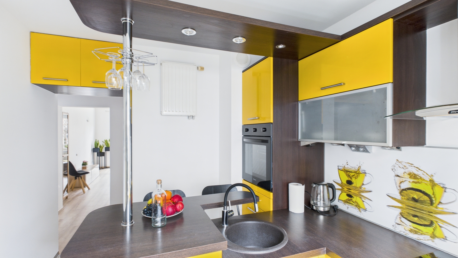 Kuchnia została urządzona w wyrazistych barwach i wyposażona w sprzęt AGD.