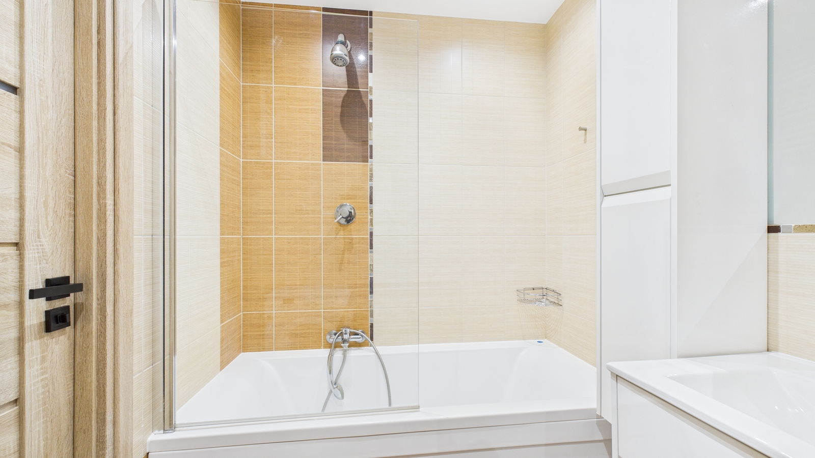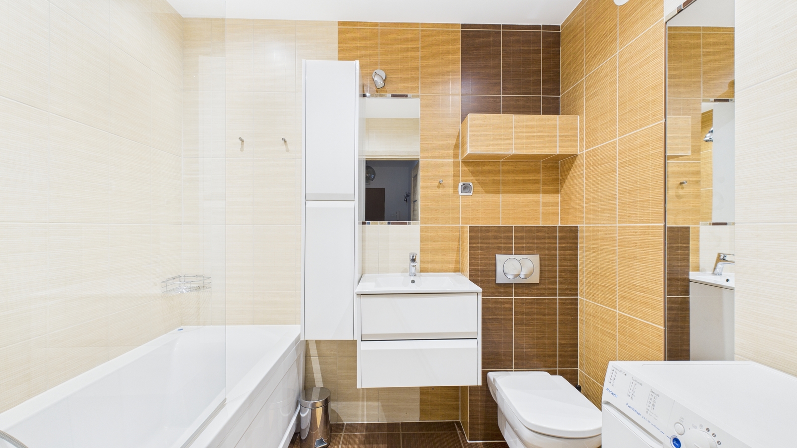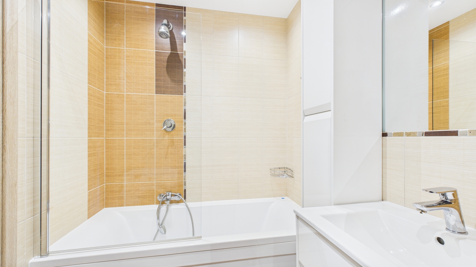 Łazienka wyposażona jest w wannę z zamontowaną szybą, co umożliwia wygodne korzystanie również z funkcji prysznica.