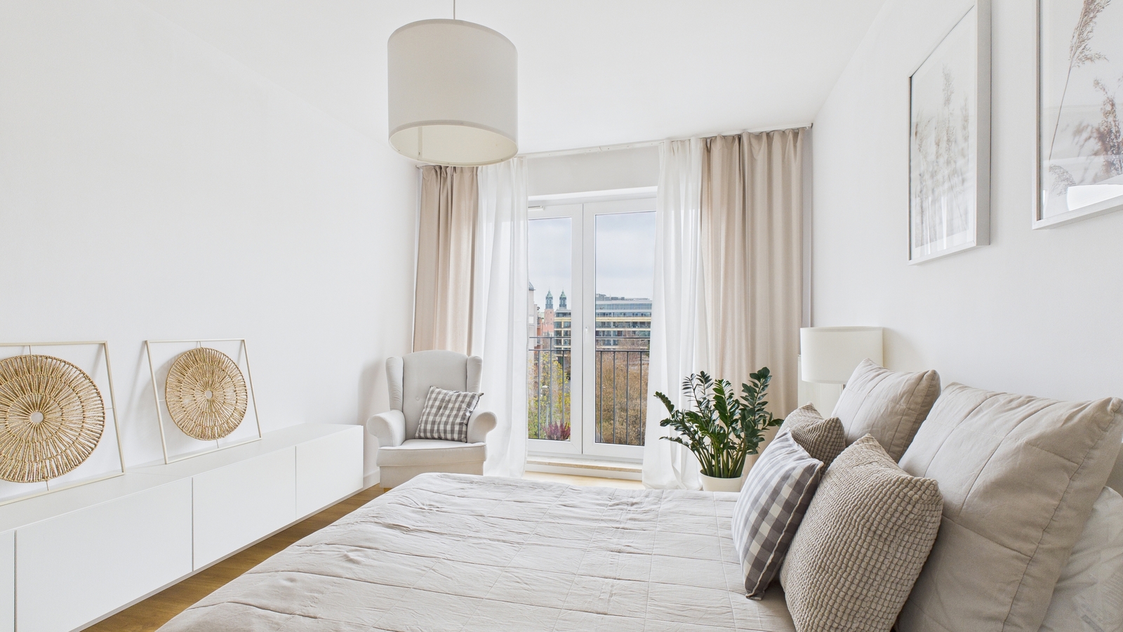 Wykończona w ciepłych, naturalnych kolorach, z dużym przeszkleniem i wyjściem na balkon. Delikatne tkaniny i spójne dekoracje tworzą atmosferę relaksu.