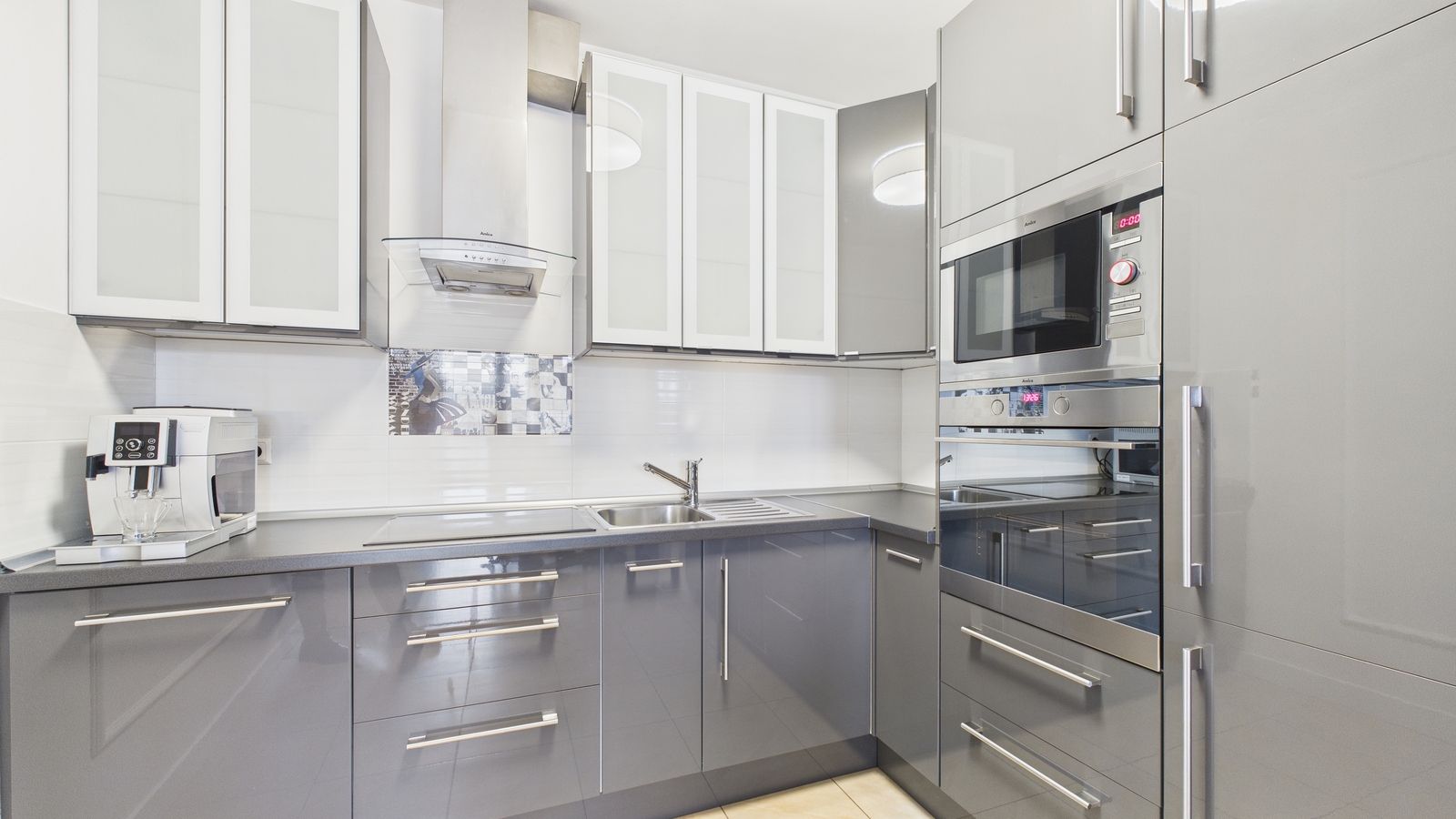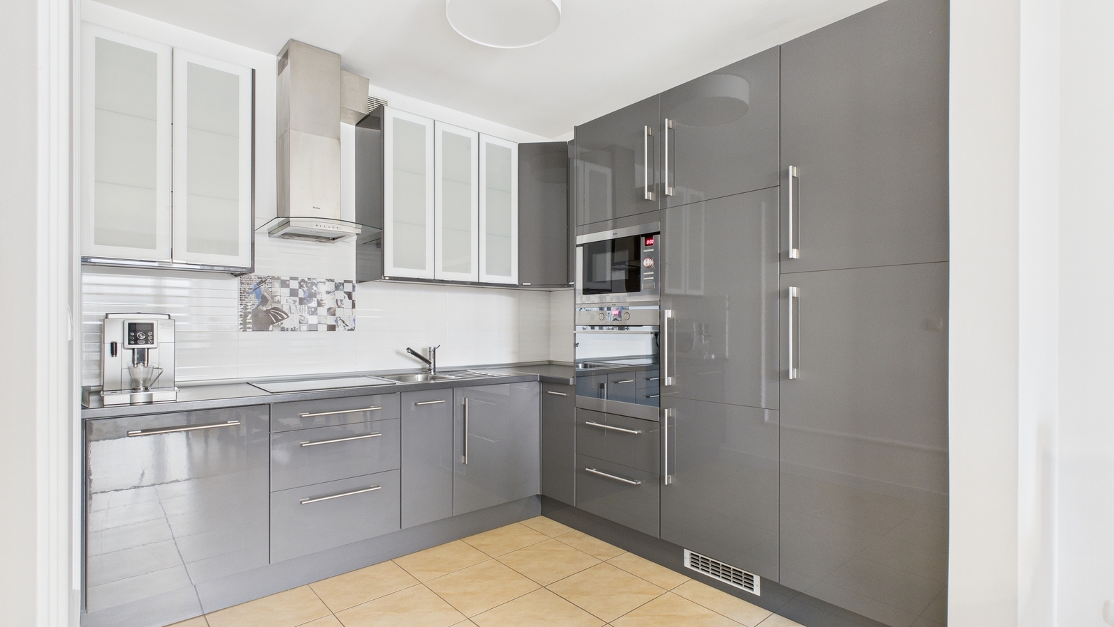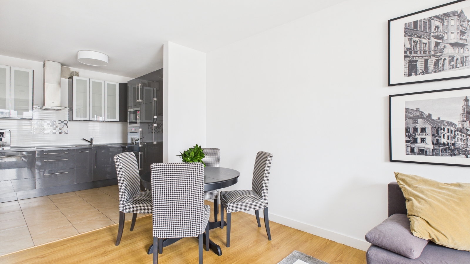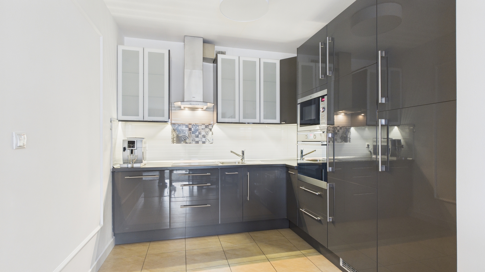 Funkcjonalna, w pełni wyposażona, z pojemnymi szafkami w wysokim połysku i kompletnym sprzętem AGD. Przestrzeń jest jasna, uporządkowana i gotowa do codziennego użytkowania.