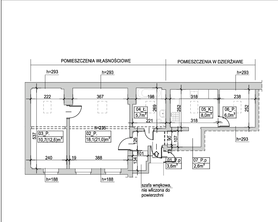 Mieszkanie składa się z części własnościowej oraz części dzierżawionej, co zostało uwzględnione w dokumentacji technicznej lokalu