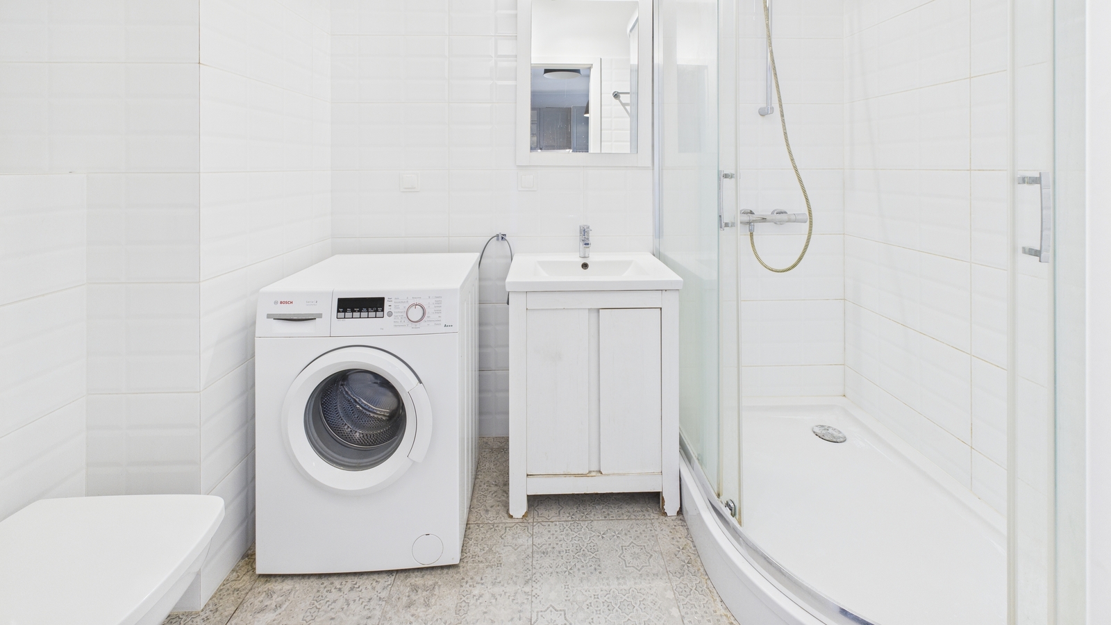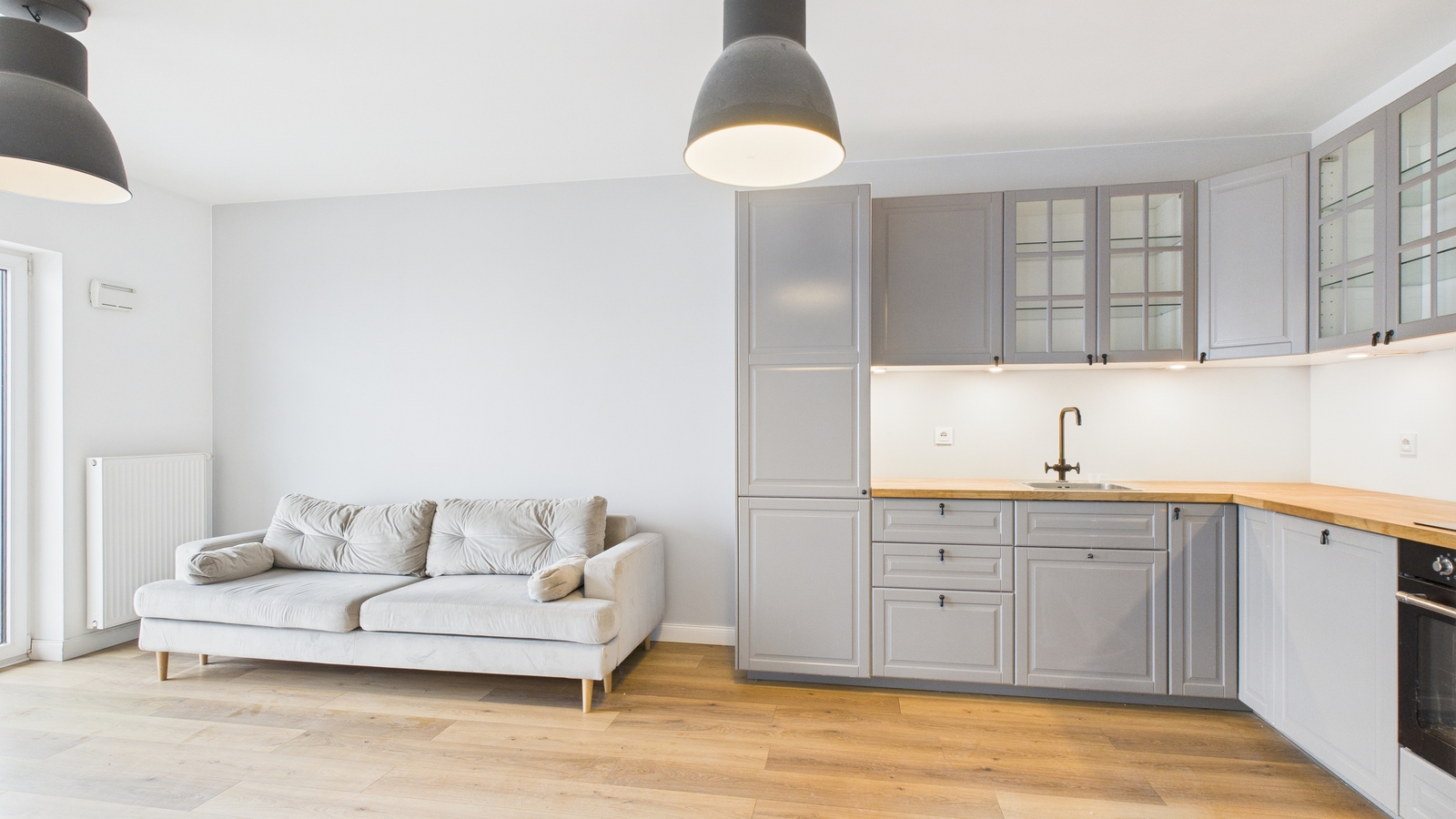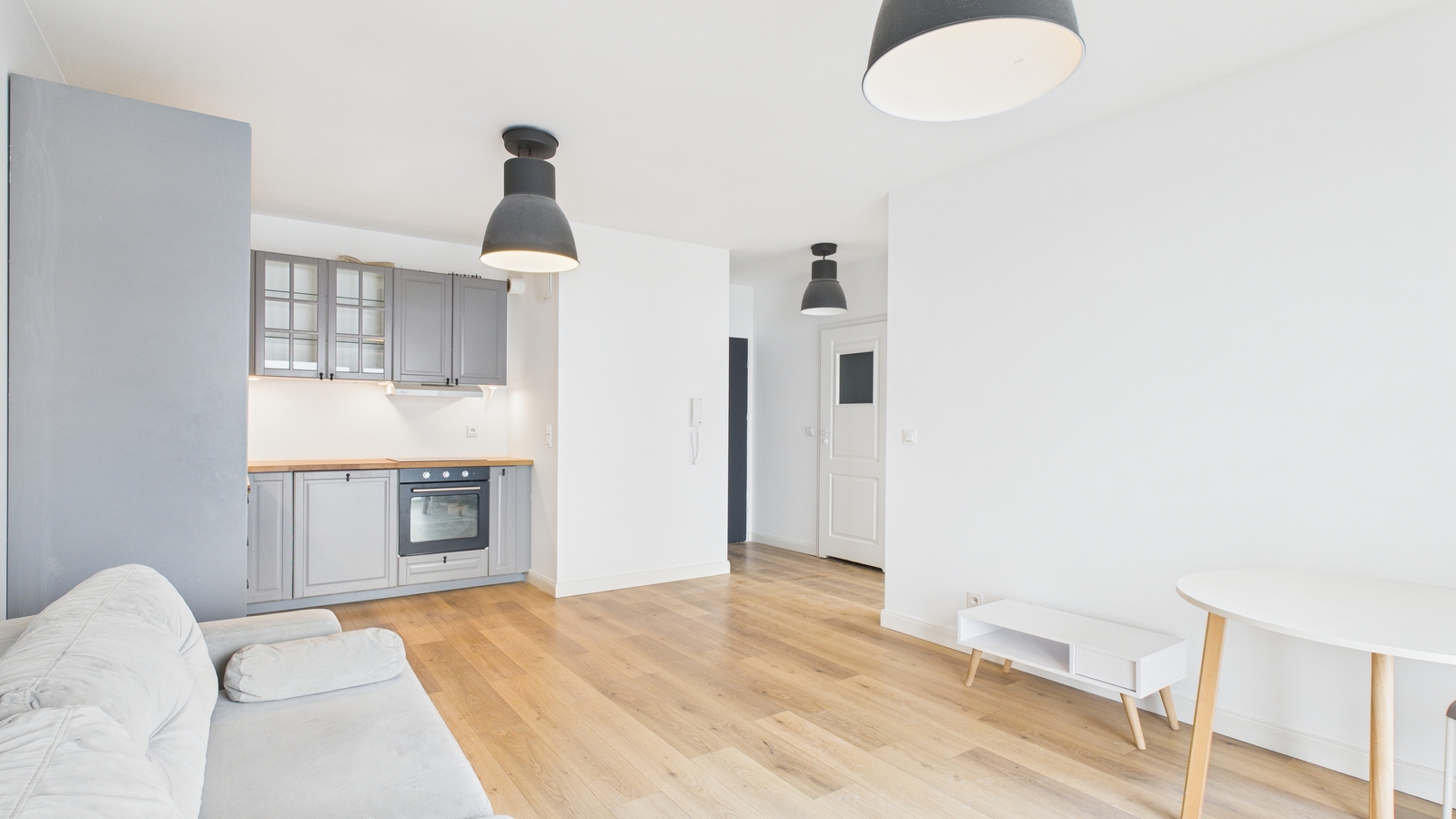 Układ i standardSalon z aneksem kuchennym tworzy jasną, otwartą przestrzeń dzienną. Sypialnia jest ustawna i dobrze doświetlona, a łazienka wyposażona w prysznic i pralkę. Całość utrzymana w neutralnej, nowoczesnej stylistyce.