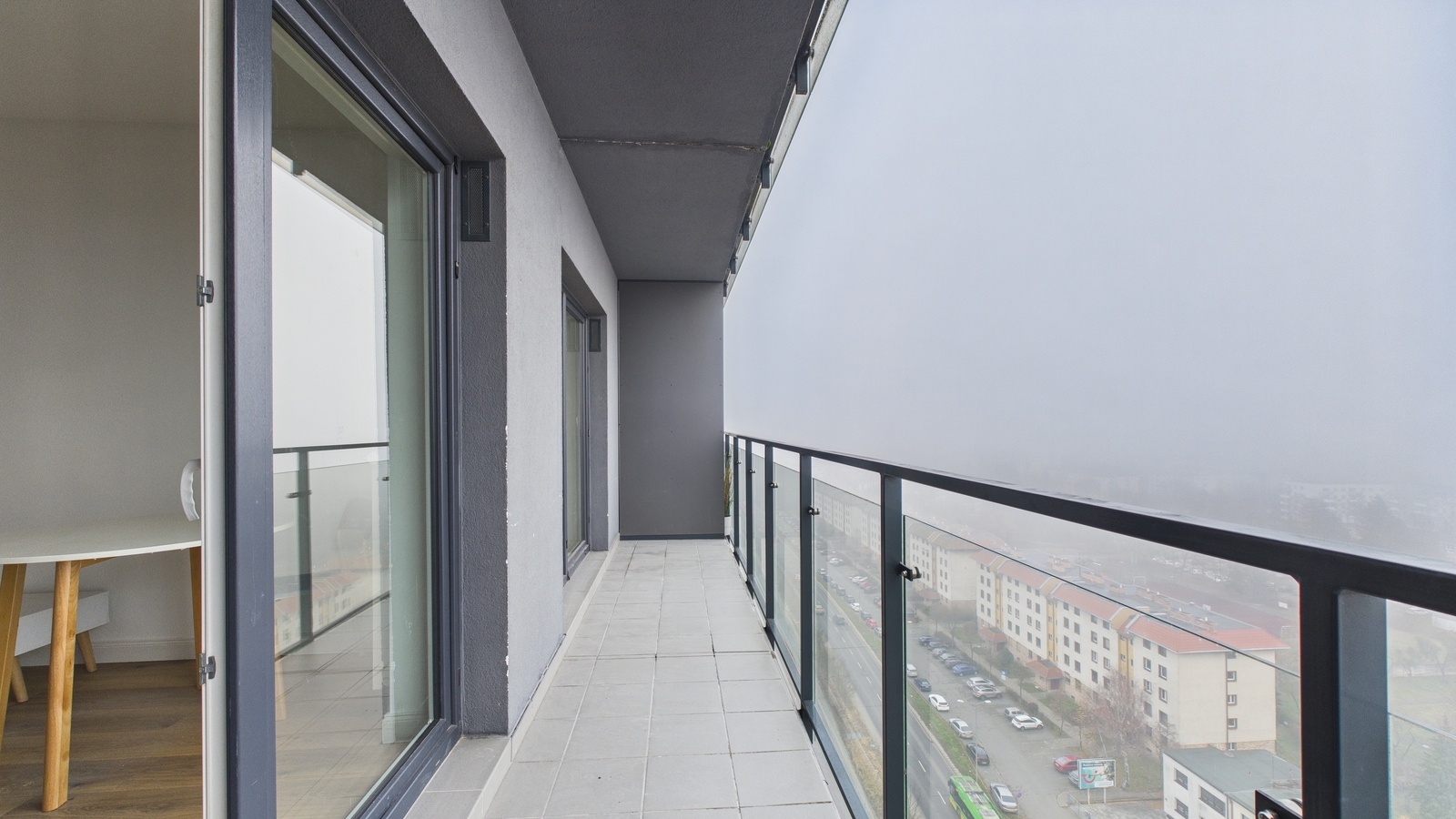 Duże przeszklenia oraz przestronny balkon oferują imponujący widok na panoramę Poznania.