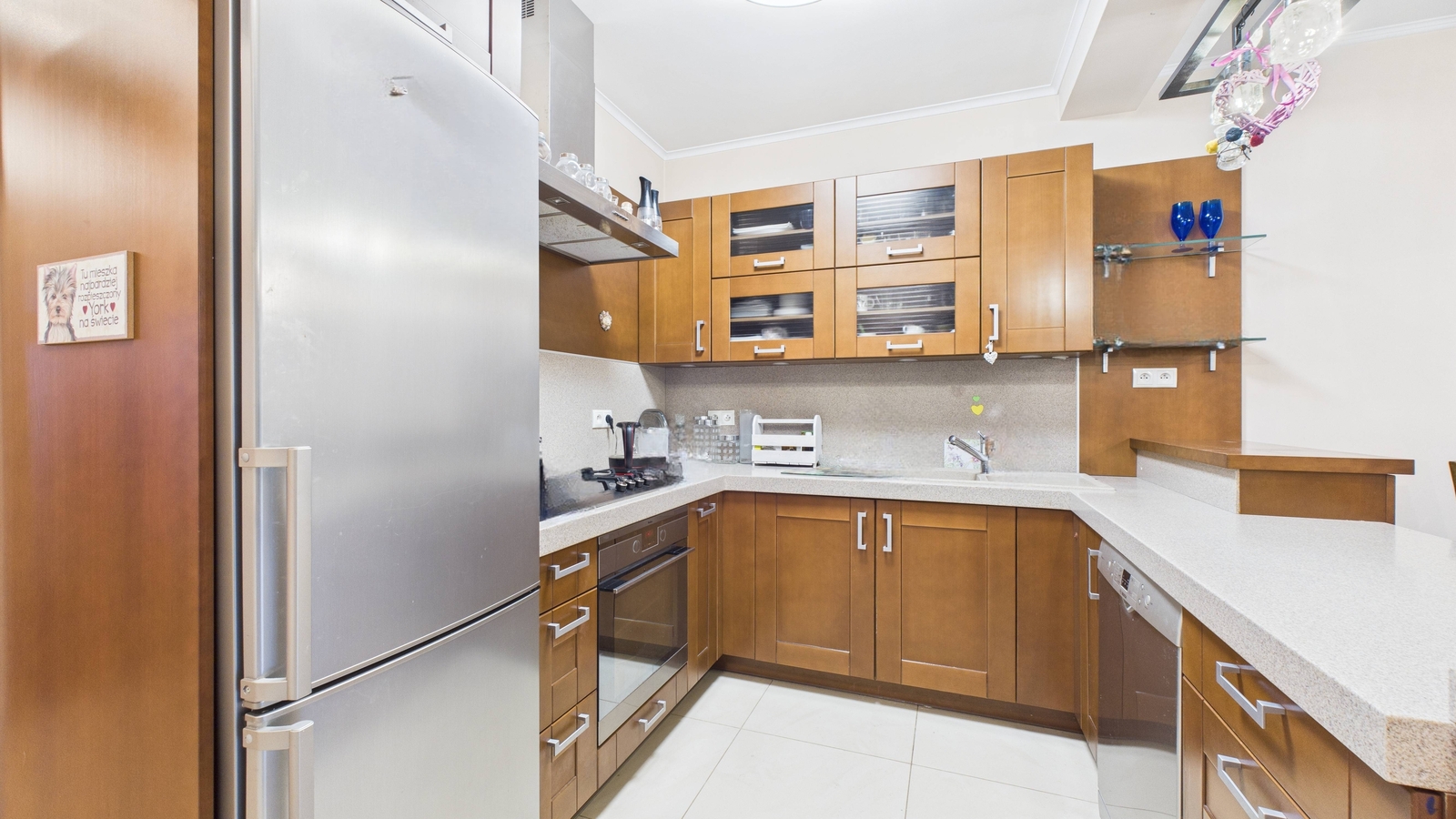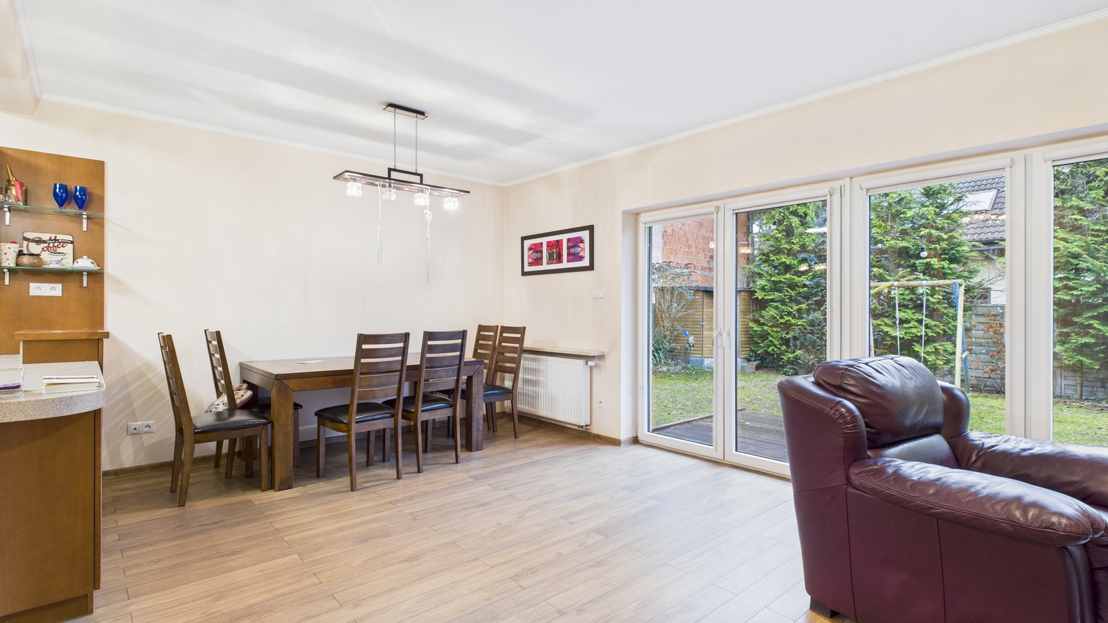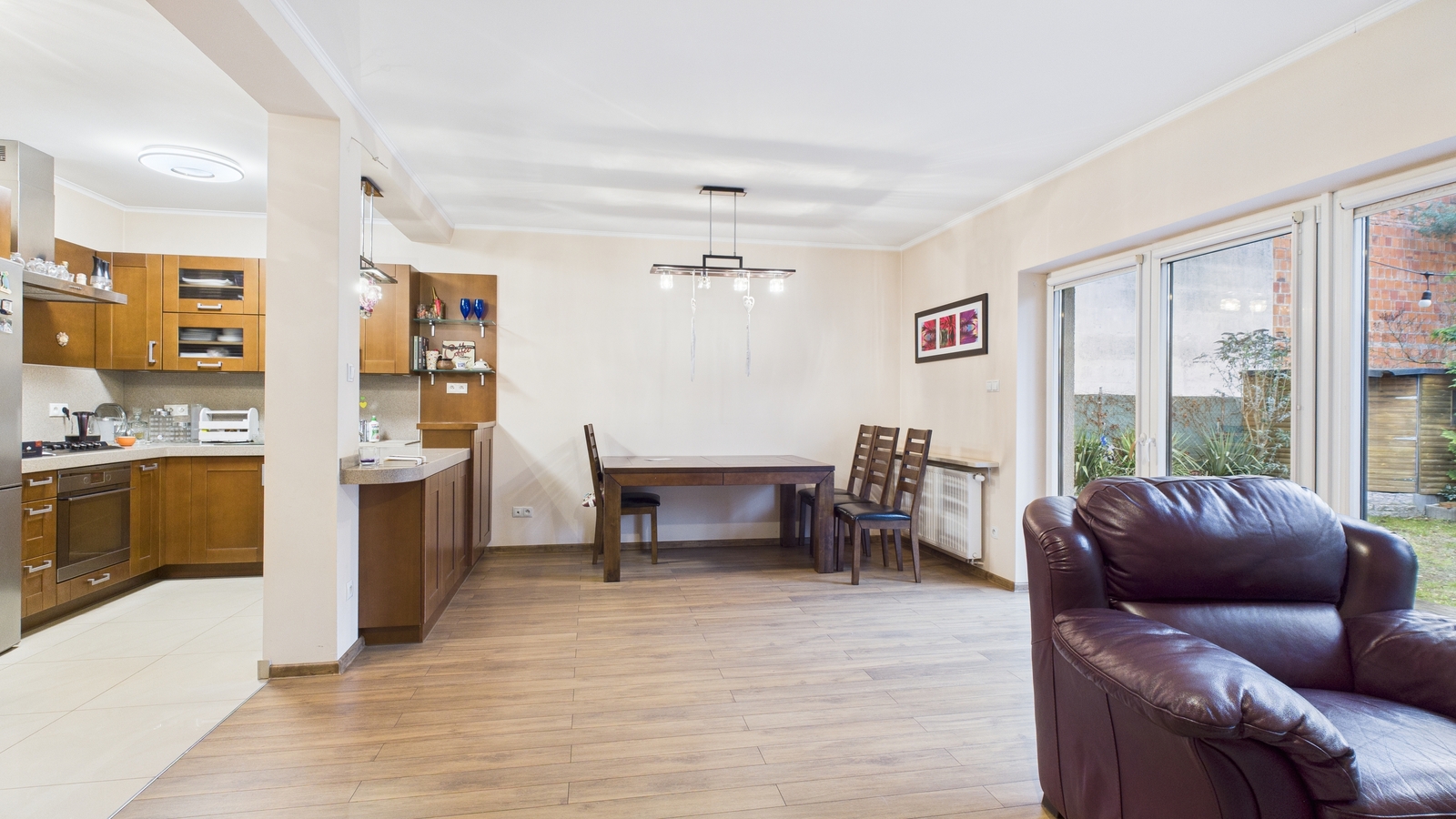 Kuchnia jest ergonomiczna, z dużą ilością blatów roboczych i miejsca do przechowywania. Bezpośrednie wyjście na taras i ogród sprawia, że letnie posiłki czy poranna kawa nabierają wyjątkowego charakteru. Ogród o powierzchni daje poczucie swobody i prywatności, co rzadko spotyka się w zabudowie szeregowej.