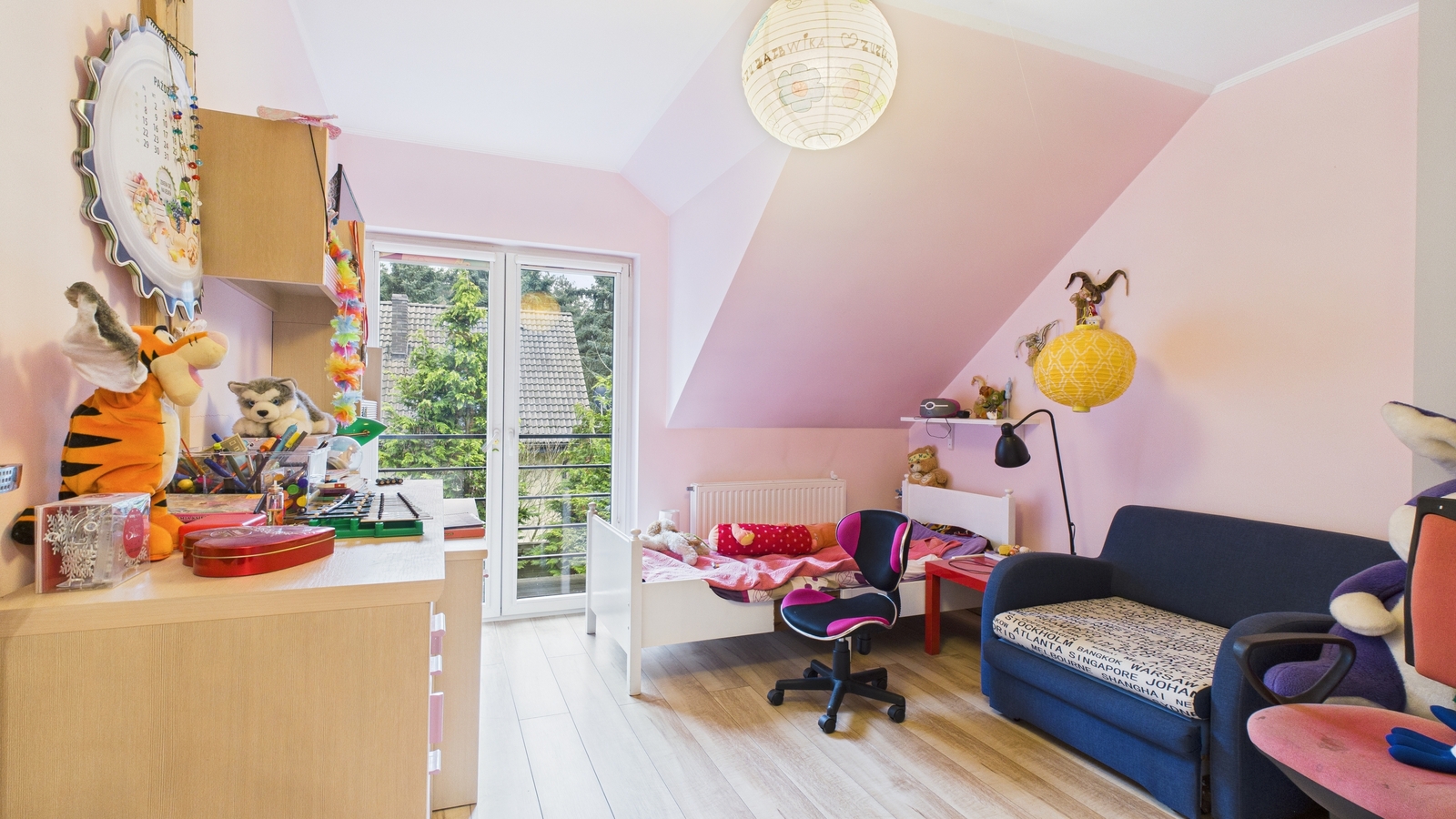 Na piętrze znajdują się ustawne sypialnie oraz łazienka. Z jednej z nich prowadzi wyjście na balkon, idealny na chwilę oddechu z widokiem na zieleń. Wnętrza są jasne, dobrze rozplanowane i łatwe do aranżacji według własnych potrzeb.