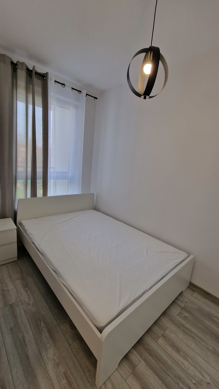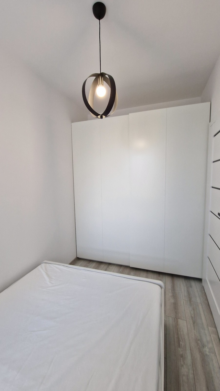 W sypialni łóżko z materacem (140cm) oraz szafa zabudowana.