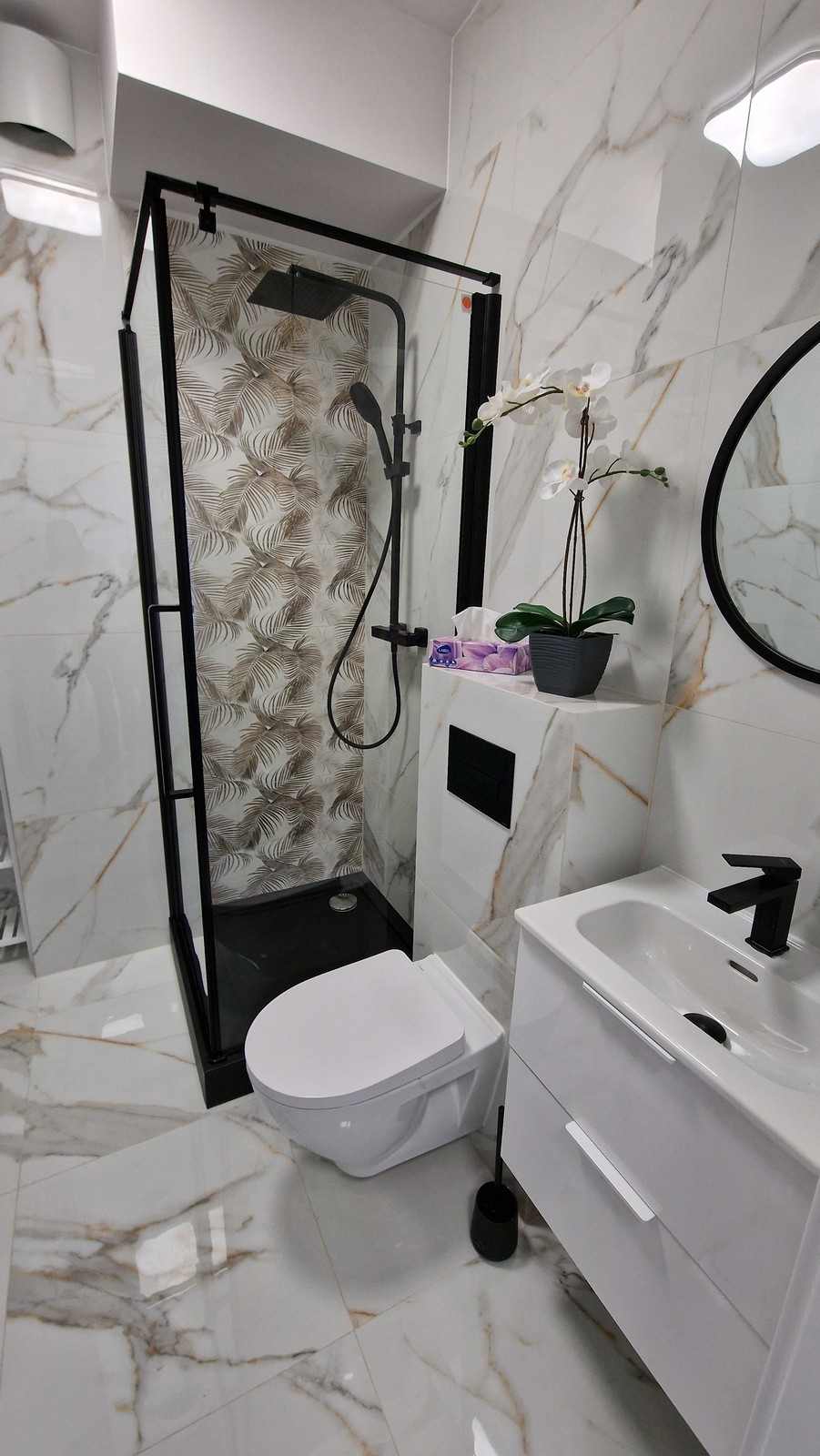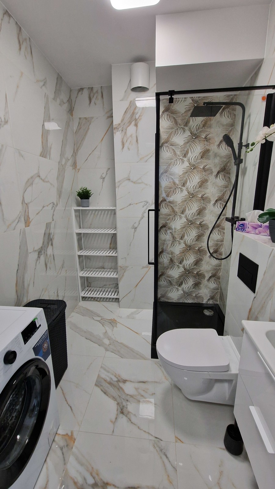 W łazience prysznic, pralka oraz pełna armatura łazienkowa.