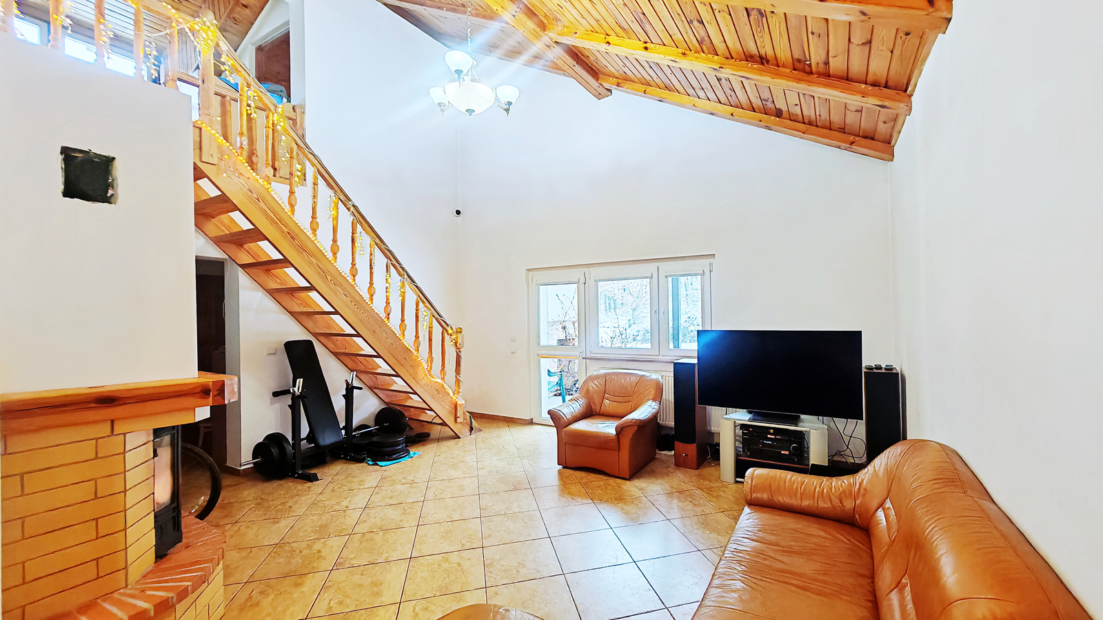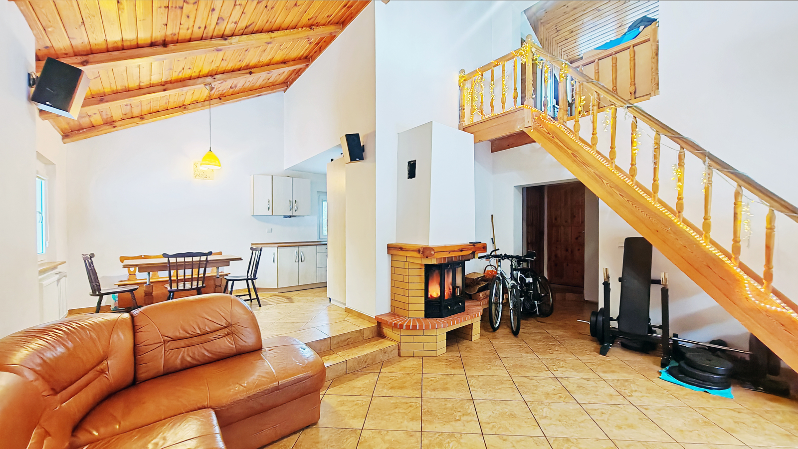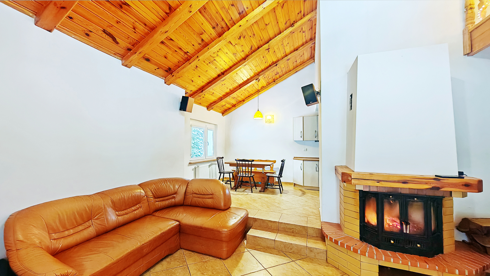 - przestronny salon z kominkiem, idealny na długie, spokojne wieczory