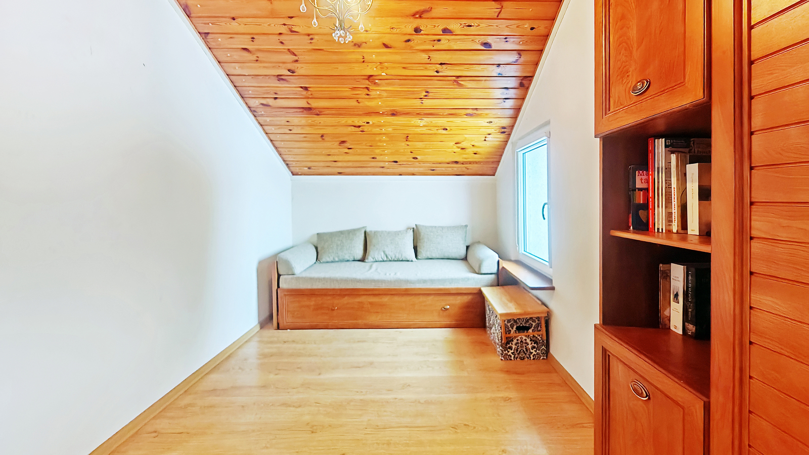 Wnętrze domu zachwyca ciepłym, rustykalnym wykończeniem, które buduje wyjątkowy klimat: