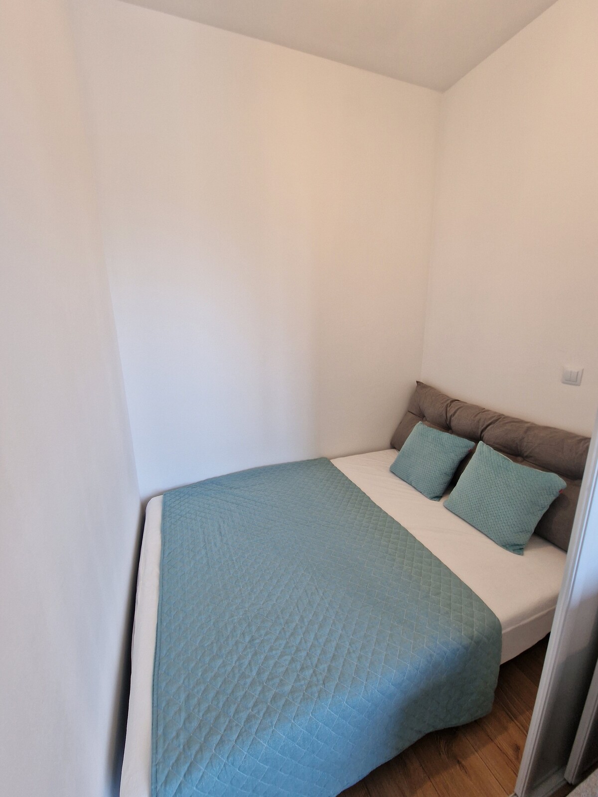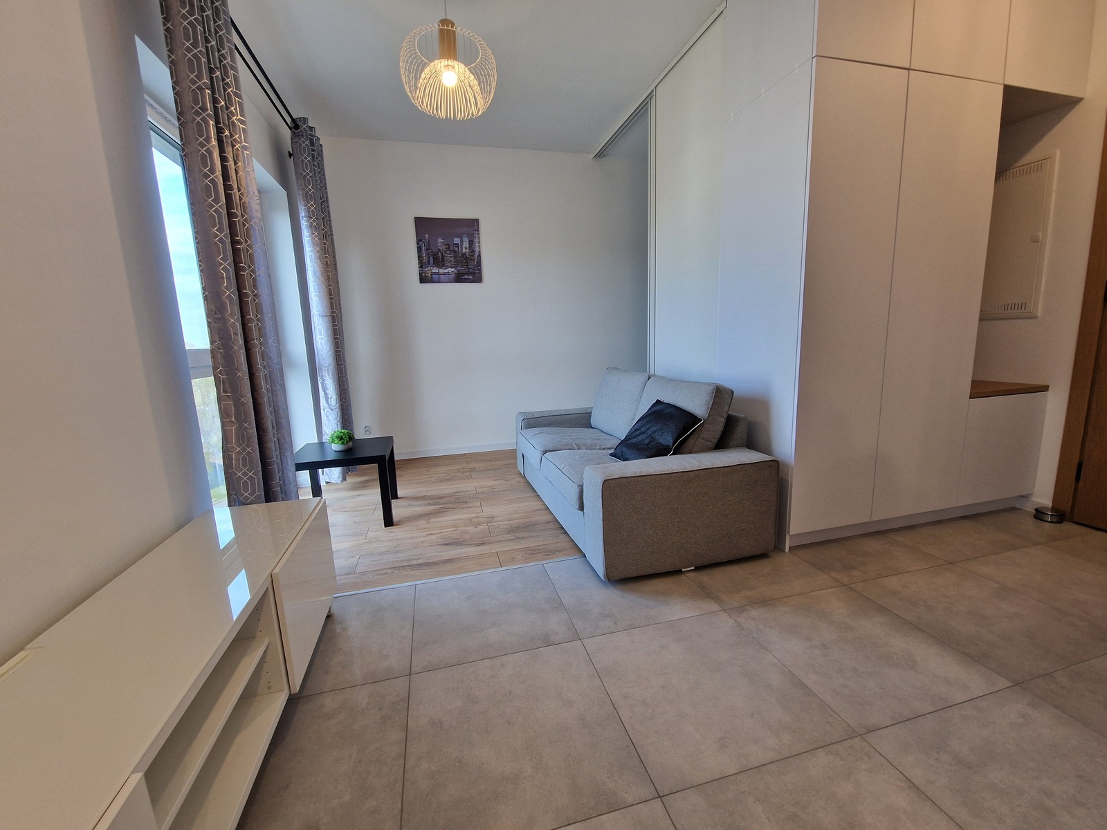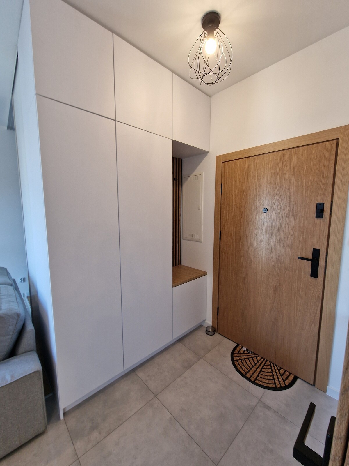 pokój (podzielony na część dzienną i sypialnianą) aneks kuchenny z oknem, duża łazienka, korytarz z szafą na wymiar.