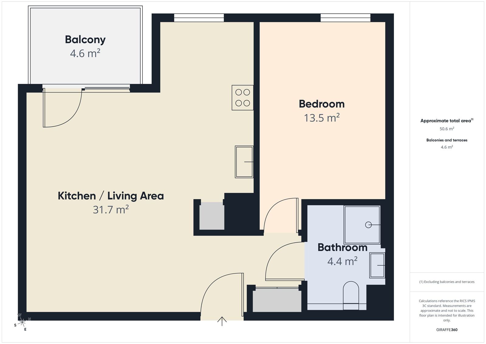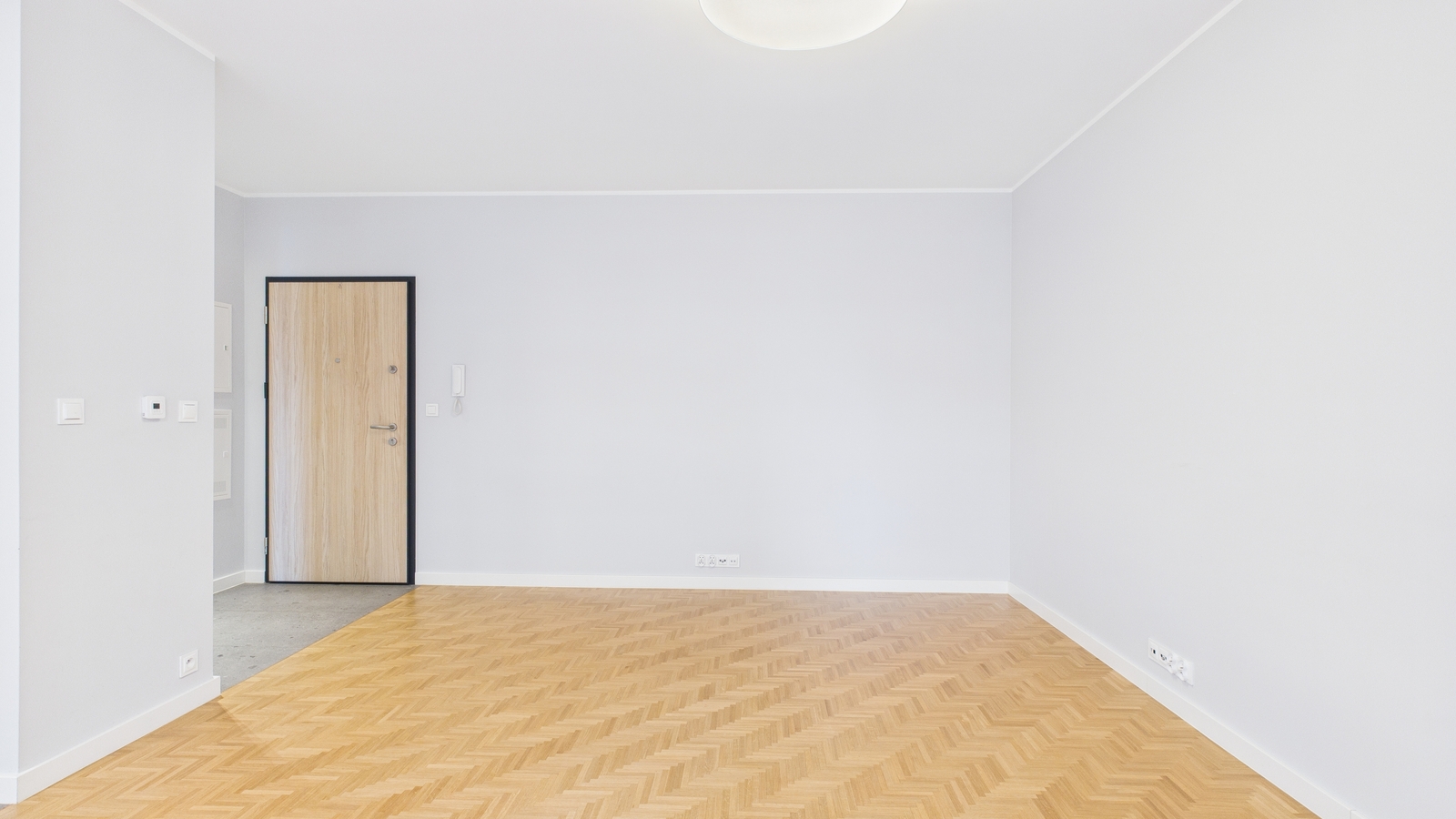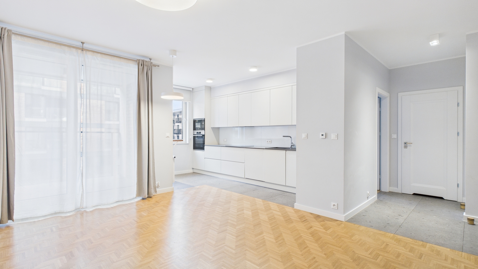 Salon z aneksem kuchennym (31,7 m²) z pełną zabudową kuchenną i sprzętem AGD, drewniana podłoga w jodełkę, dostęp do balkonu (4,6 m²).