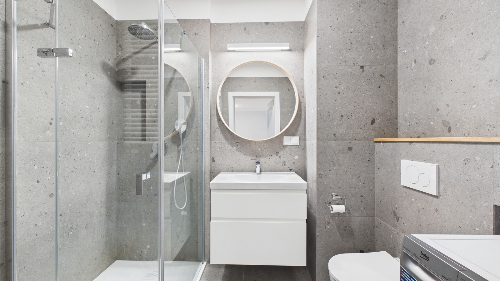 Łazienka (4,4 m²) z kabiną prysznicową, pralką i oświetleniem LED.