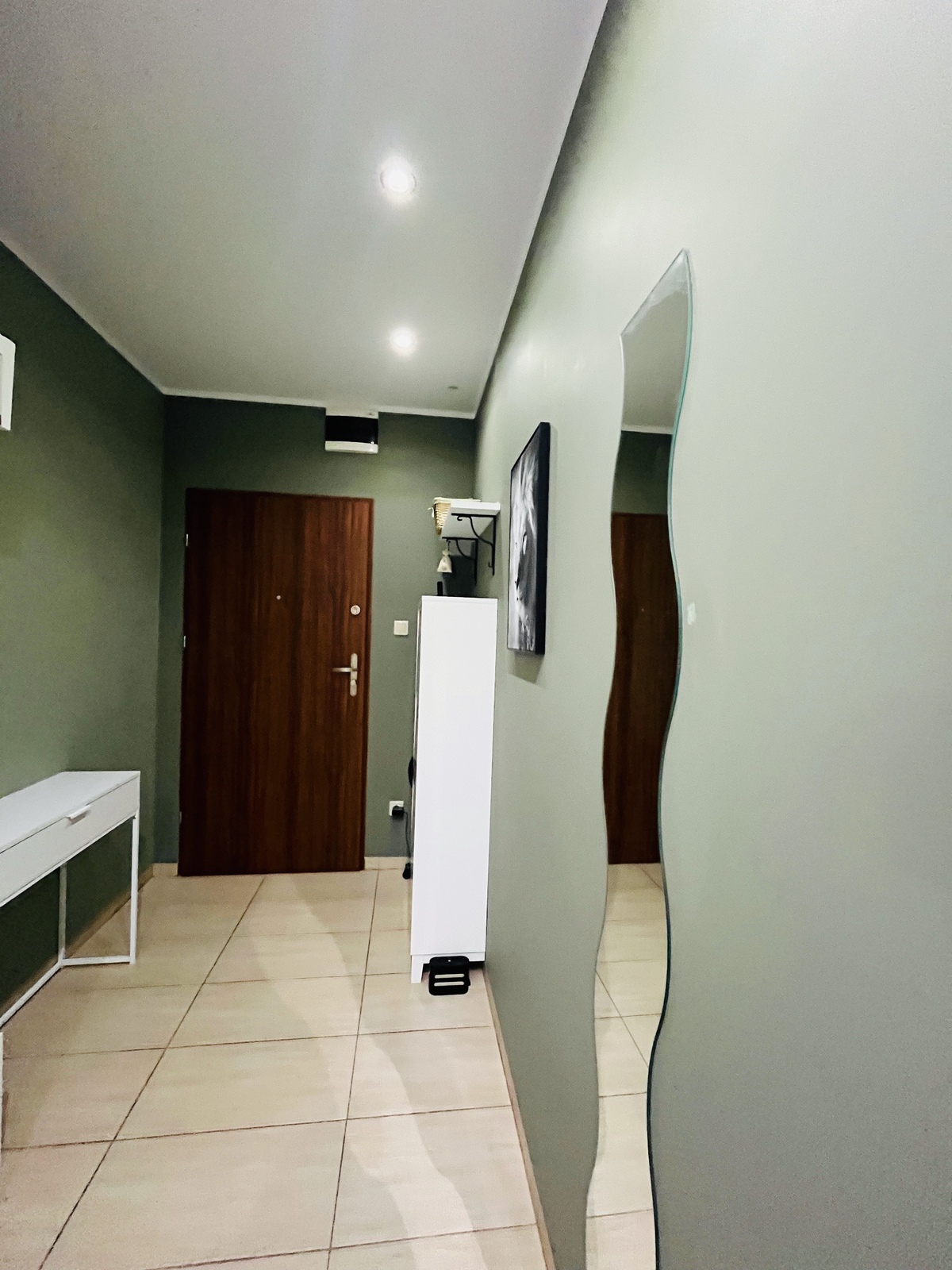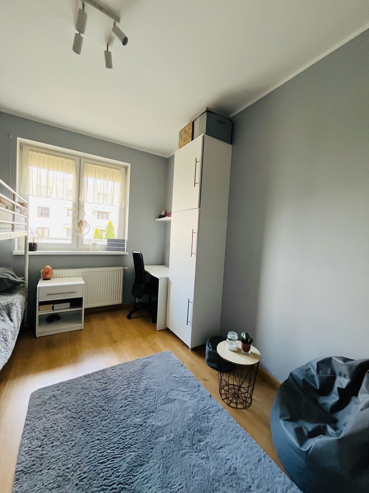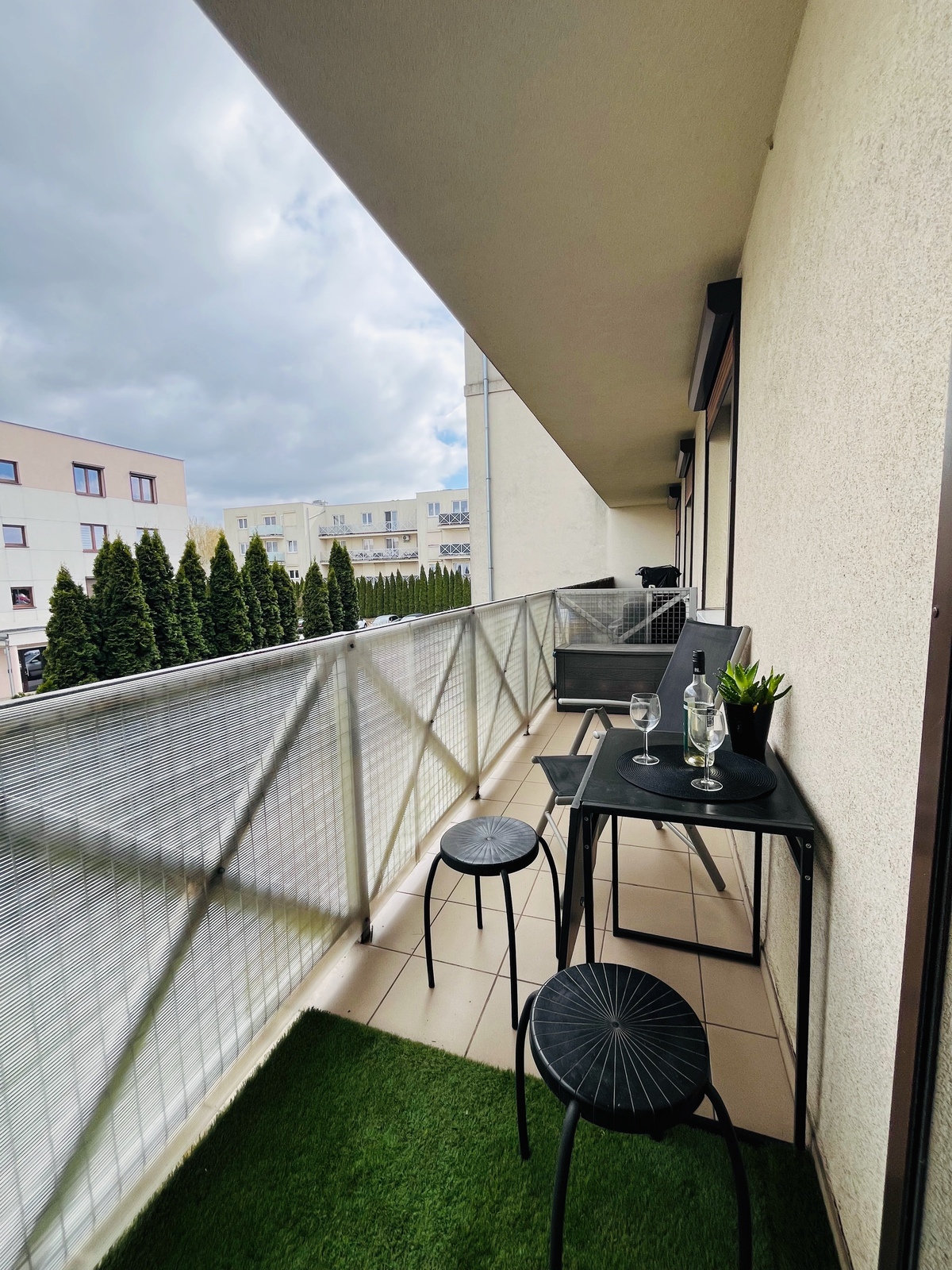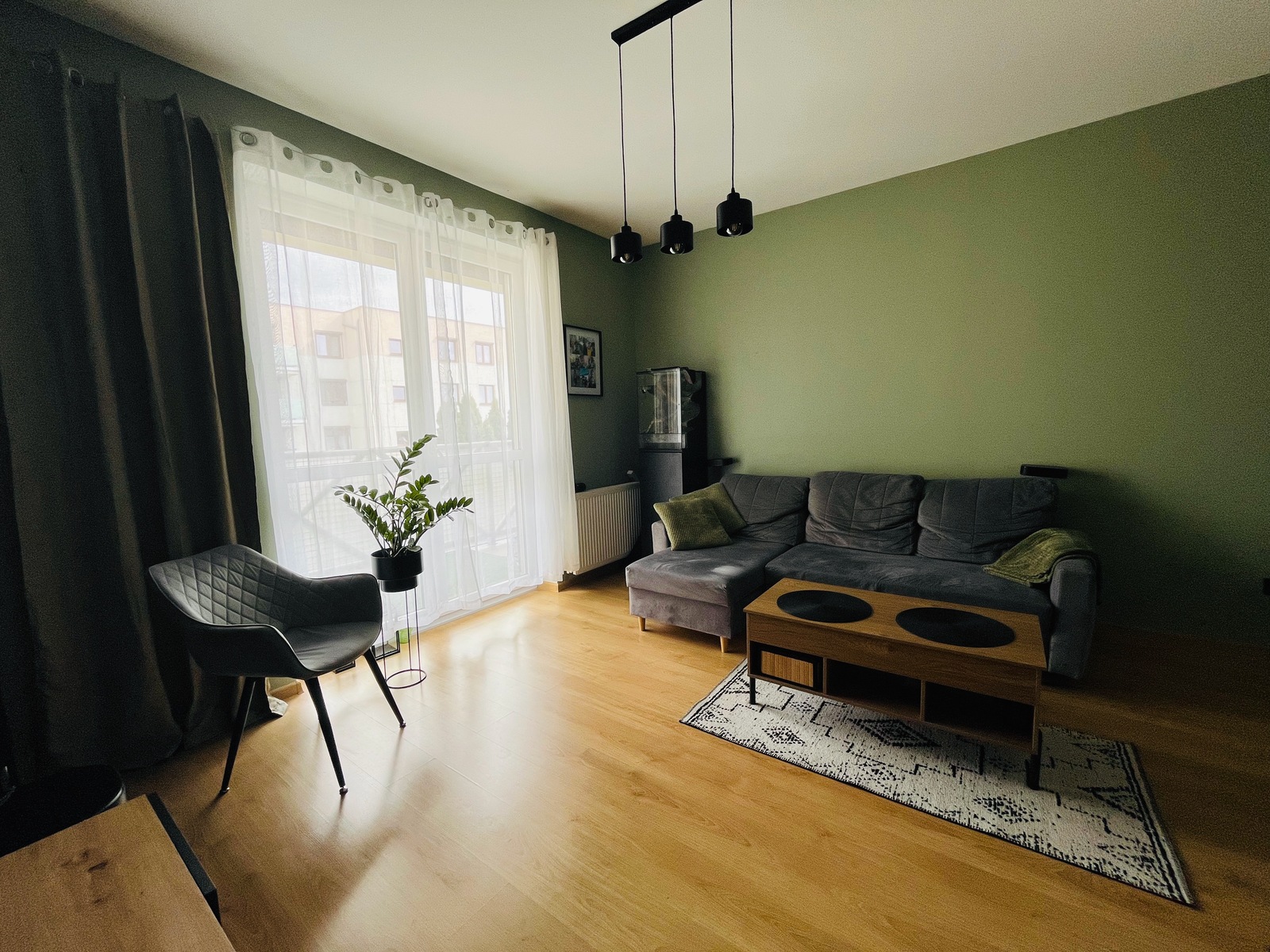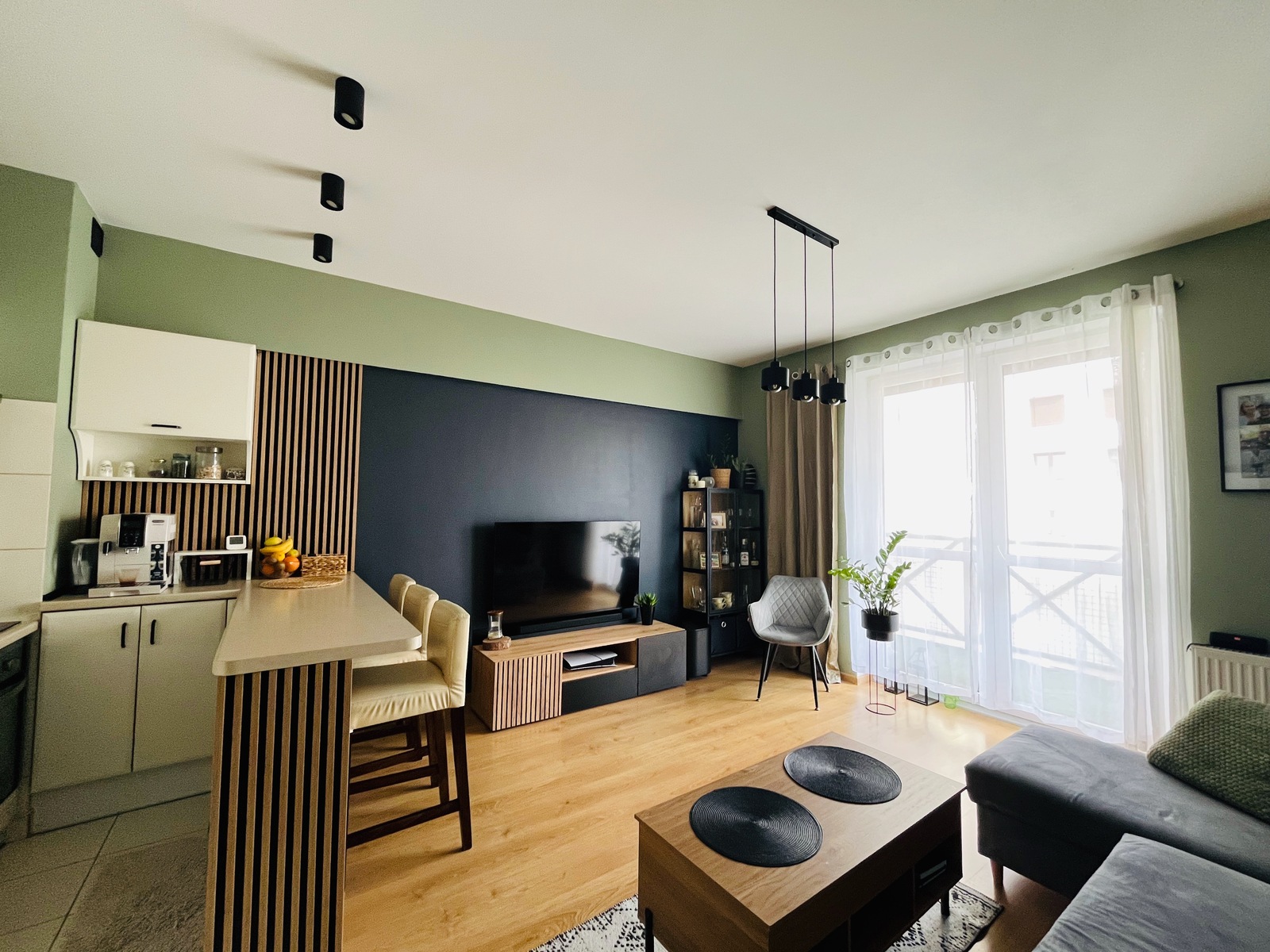 Mieszkanie składa się z przestronnego salonu z aneksem kuchennym co tworzy nowoczesną funkcjonalną przestrzeń dzienną, sypialni, łazienki oraz przedpokoju. z salonu prowadzi wyjście na duży balkon, który stanowi doskonałe miejsce do relaksu, porannej kawy czy odpoczynku po pracy. Nieruchomość jest częściowo umeblowana, co pozwala na szybkie wprowadzenie się lub swobodną aranżację według własnego gustu. Aneks kuchenny wyposażony jest w podstawową zabudowę oraz sprzęty. W oknach zamontowane zostały rolety zewnętrzne.