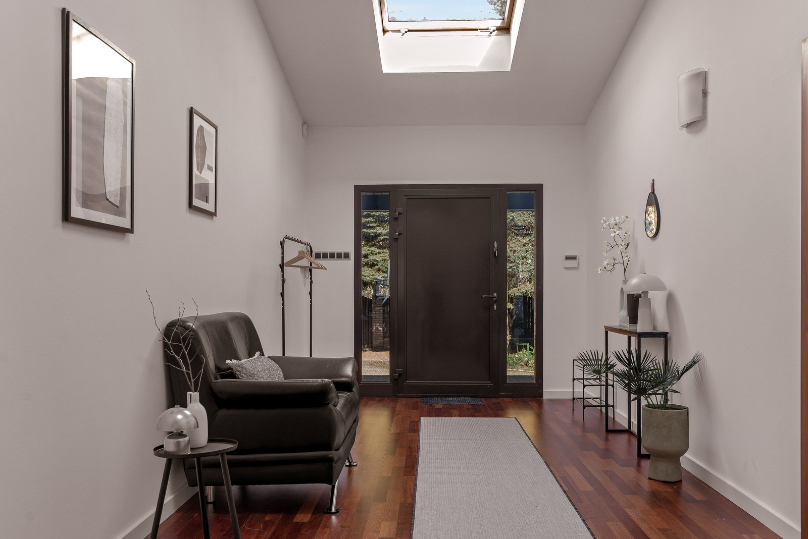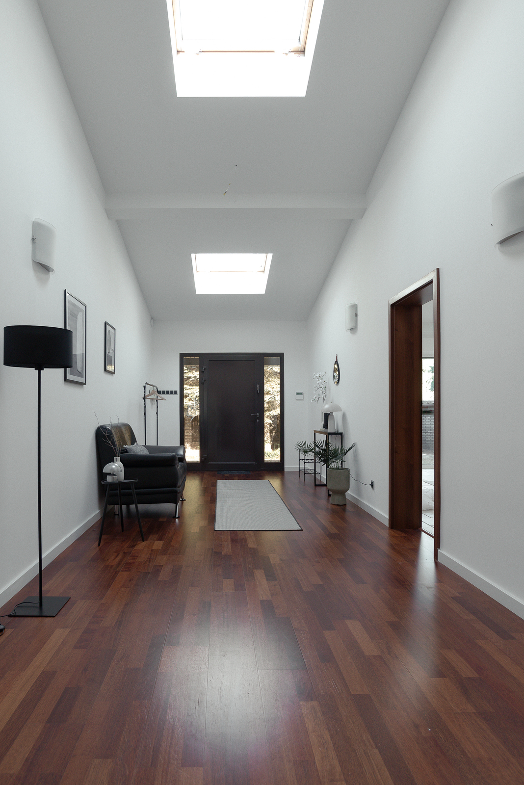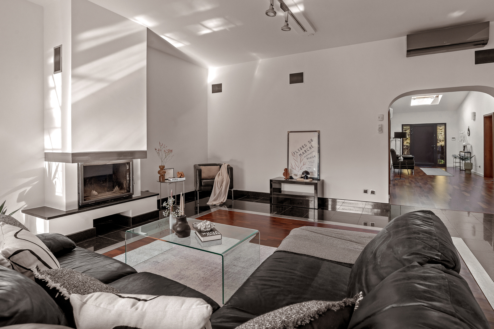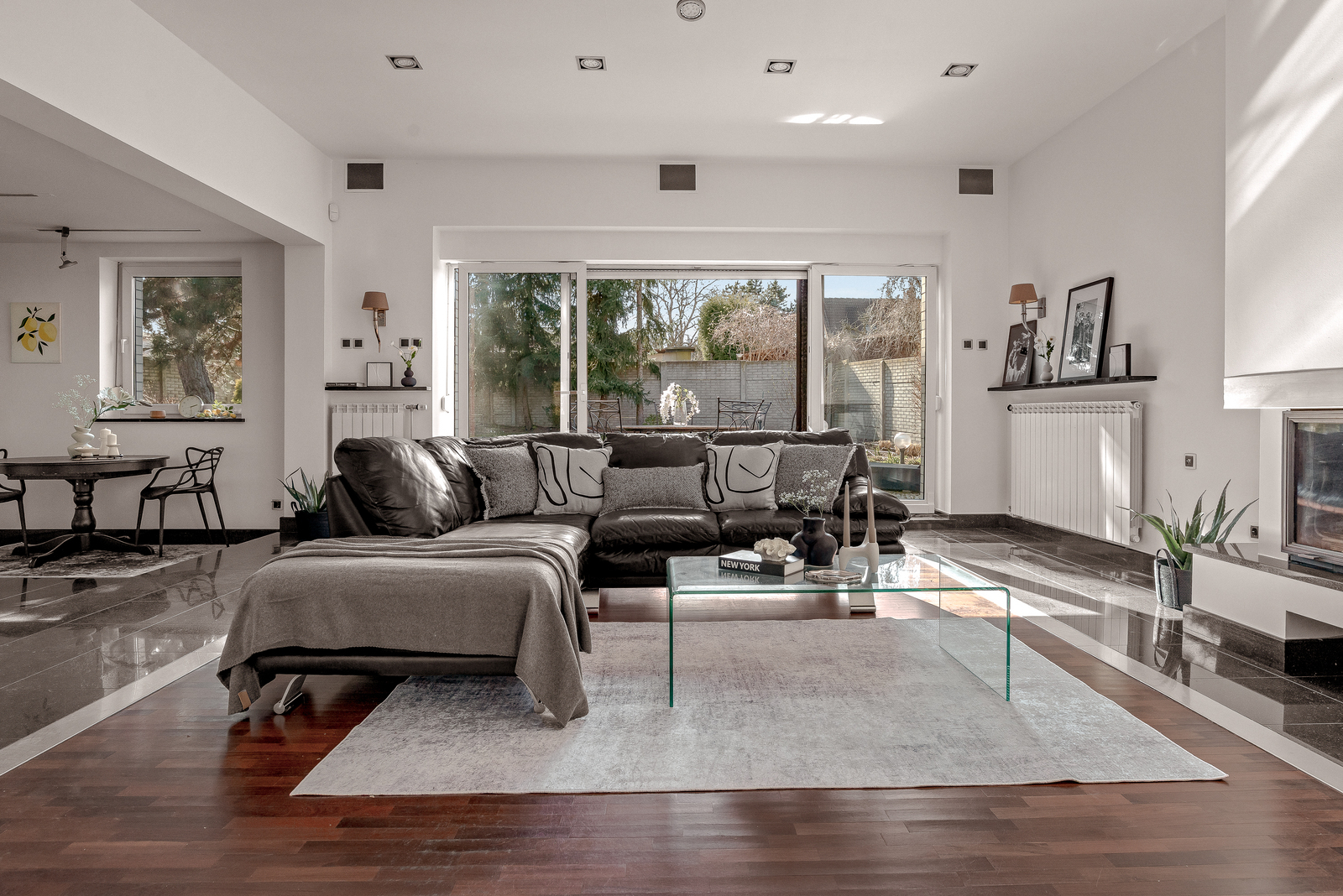 Wnętrza wyróżniają się wysokimi sufitami, dużymi przeszkleniami oraz eleganckim wykończeniem.