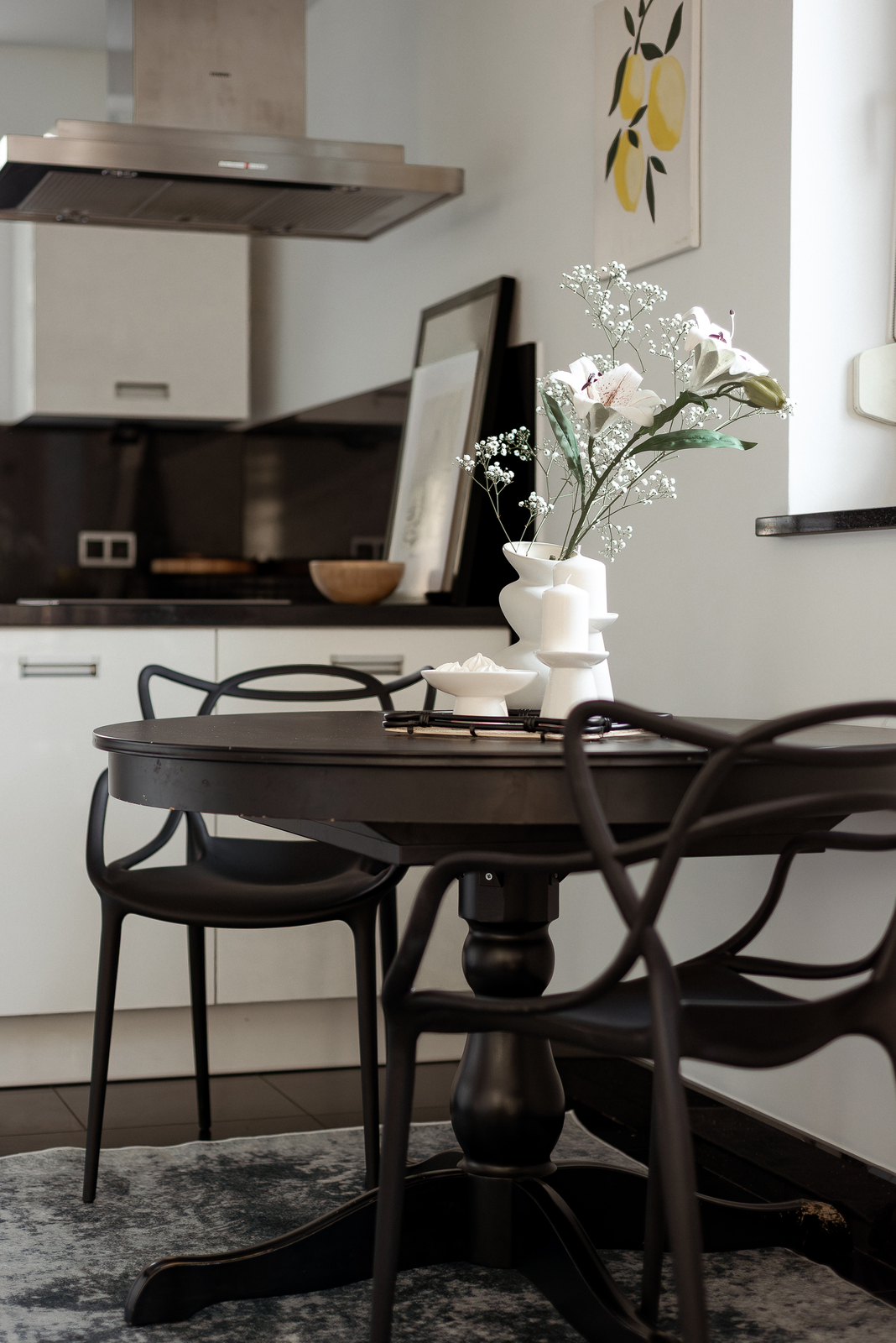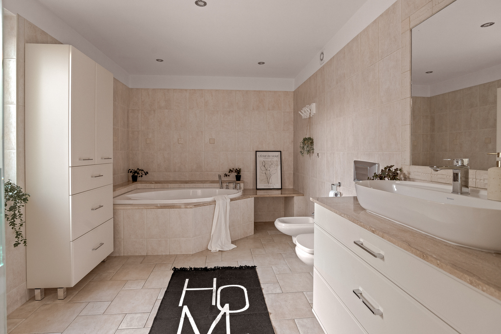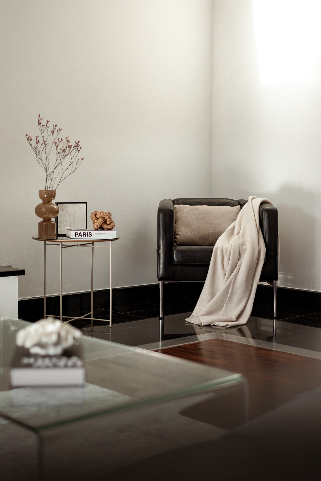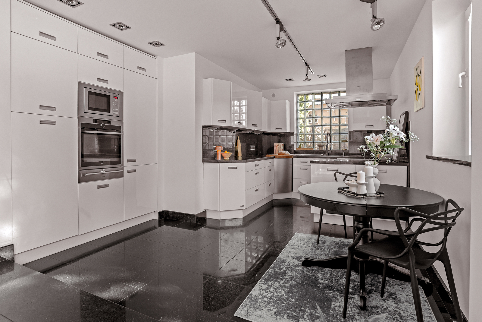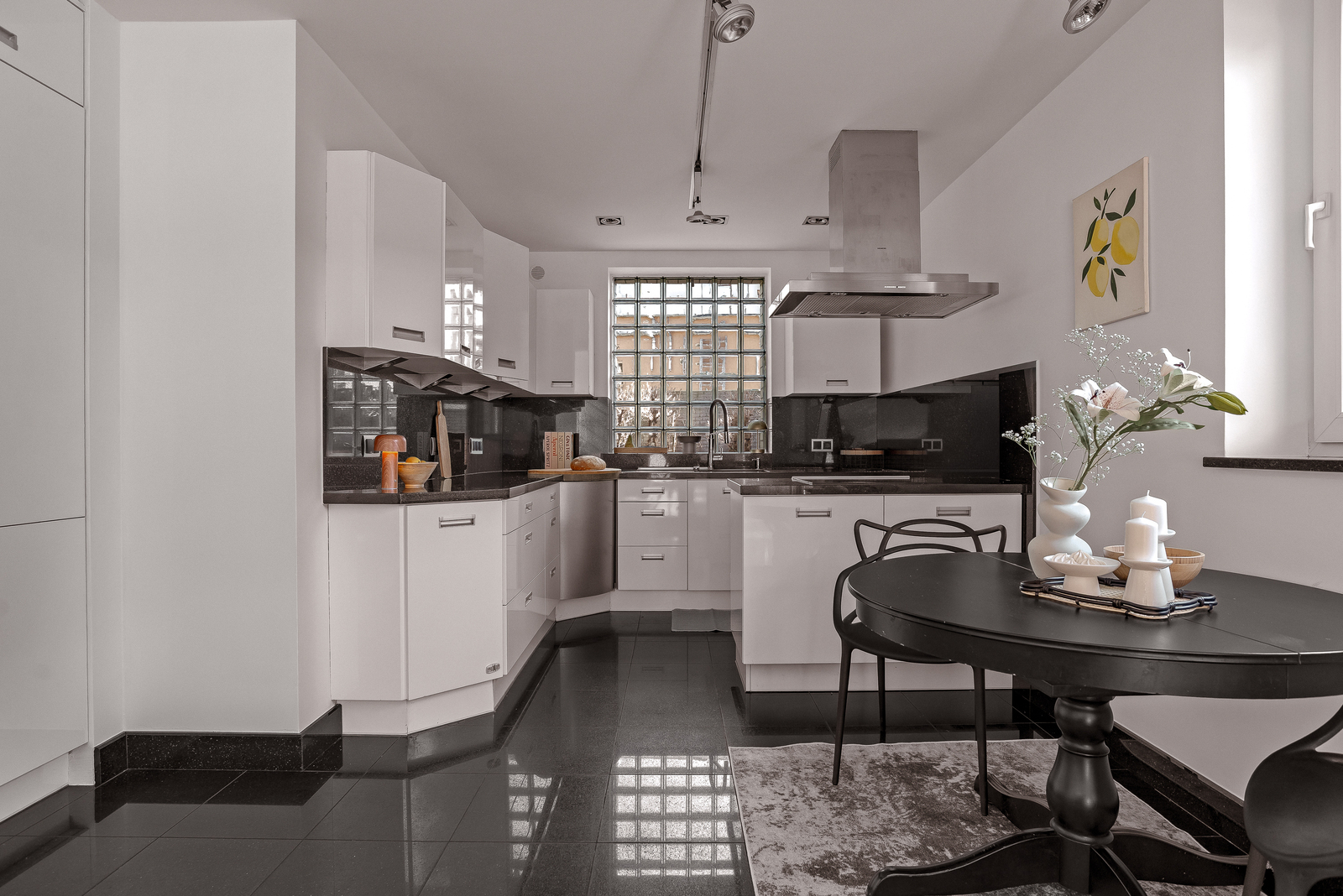 Wnętrza wyróżniają się wysokimi sufitami, dużymi przeszkleniami oraz eleganckim wykończeniem.
