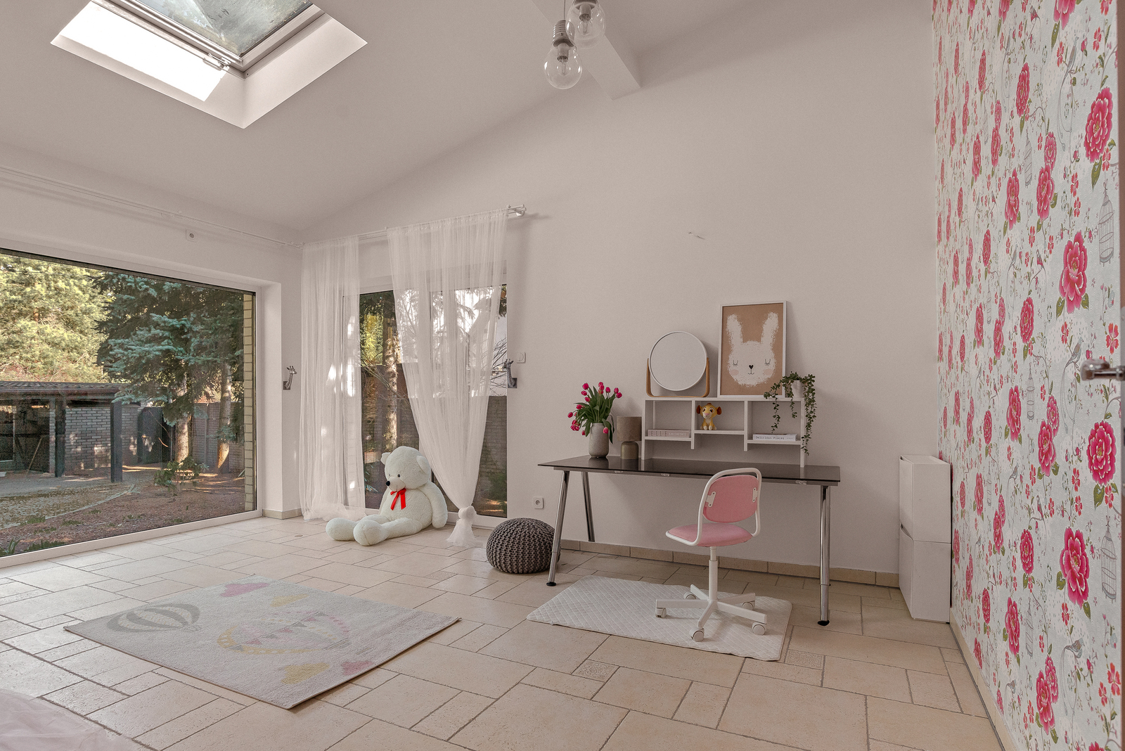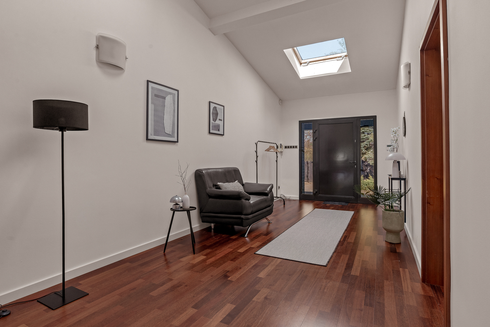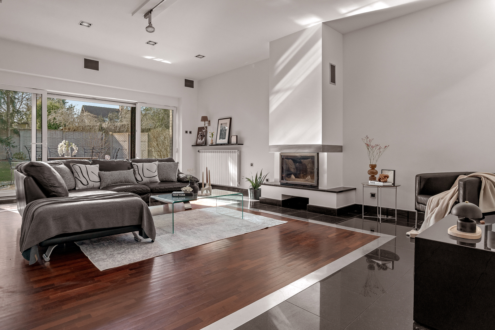 Centralną częścią domu jest przestronny salon z kominkiem, który tworzy przytulną atmosferę i płynnie łączy się z częścią jadalnianą oraz kuchnią. Duże przesuwne okna prowadzą bezpośrednio na taras i do ogrodu, dzięki czemu wnętrze naturalnie łączy się z przestrzenią zewnętrzną.