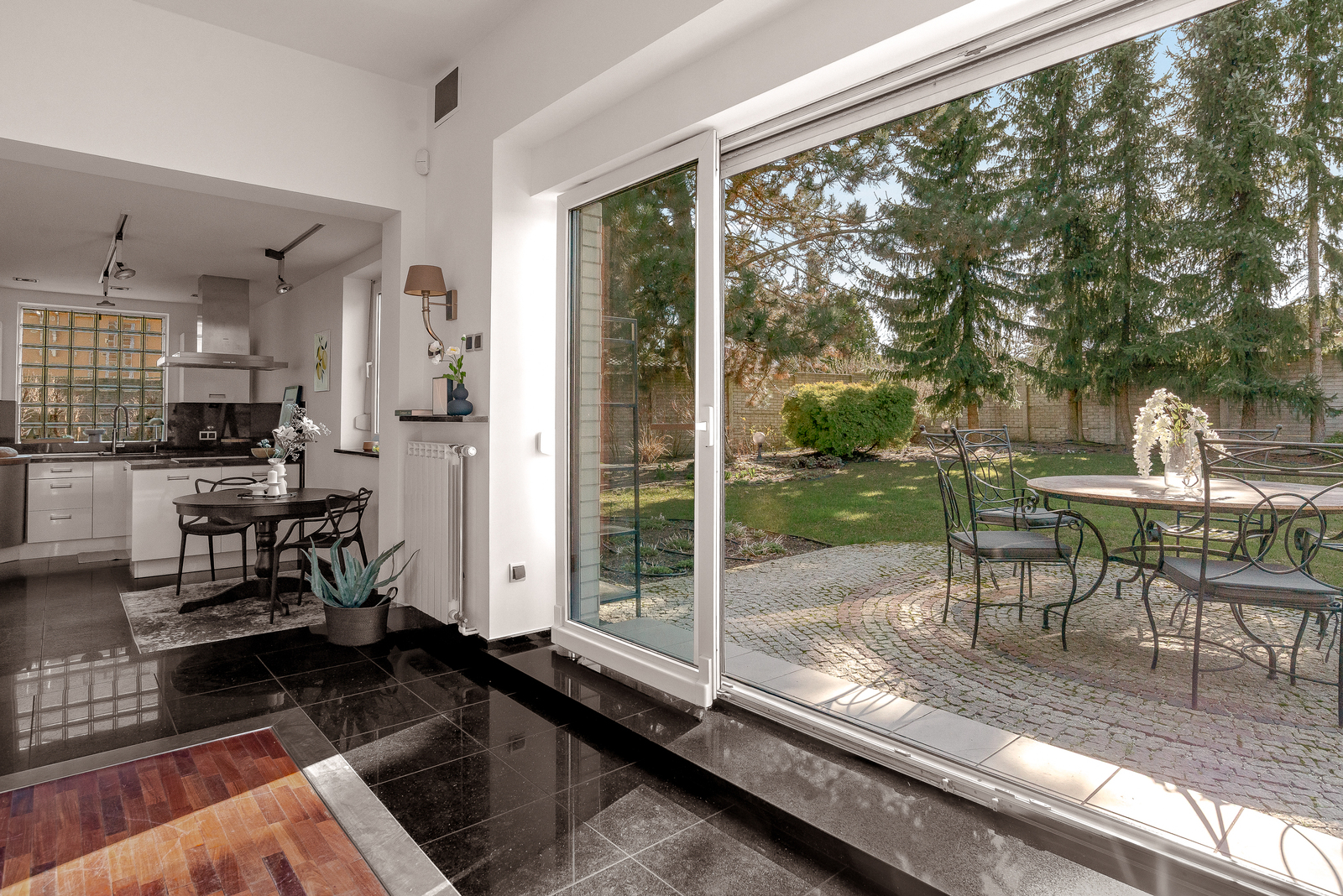 Duży taras z elektryczną markizą pozwala komfortowo spędzać czas na świeżym powietrzu od wiosny do jesieni.